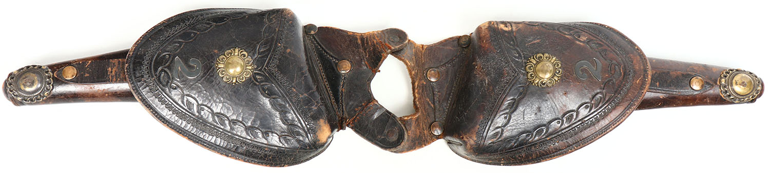 Lot of 2 antique leather pistole holsters, brass with intricit design to leather, very cool, has cracking to leather. Grade: Very Good ++ - Value: 10 to 60
