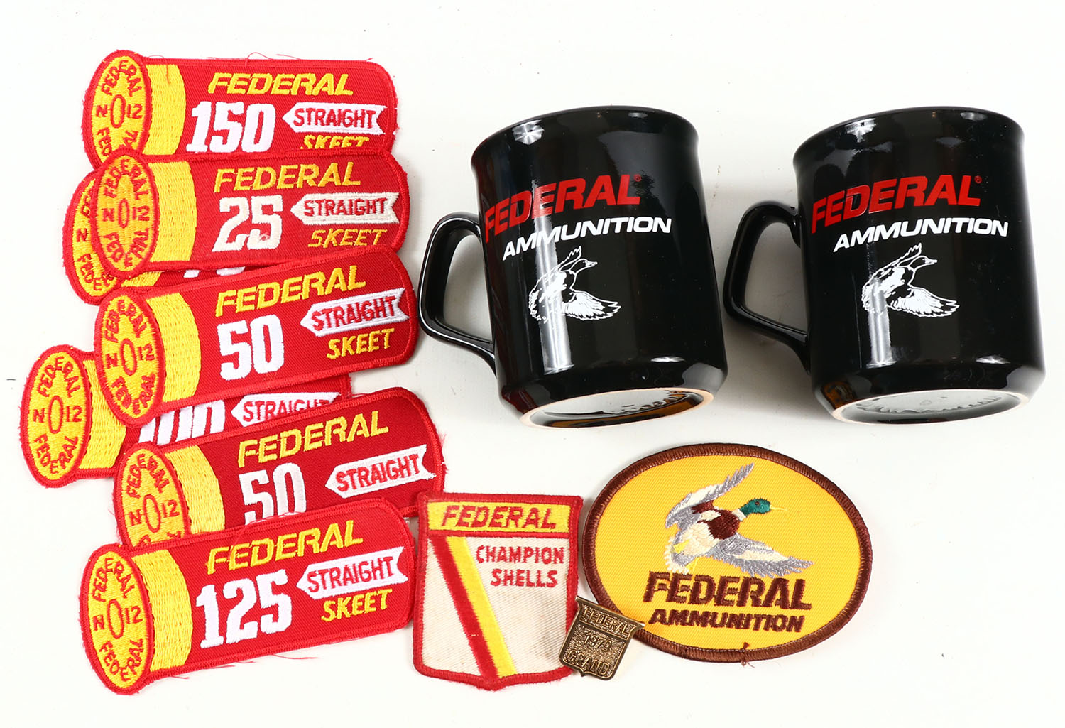 Lot of federal items, patches, pins, ruler and mugs. Grade: Excellent - Value: 4 to 40