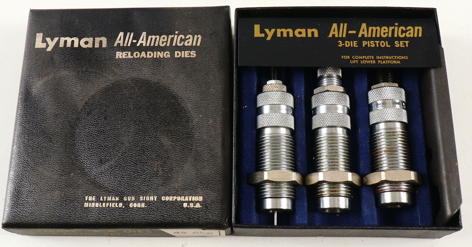 Lyman A-A reloading dies, 45 ACP, in original box. Grade: Excellent - Value: 10 to 60