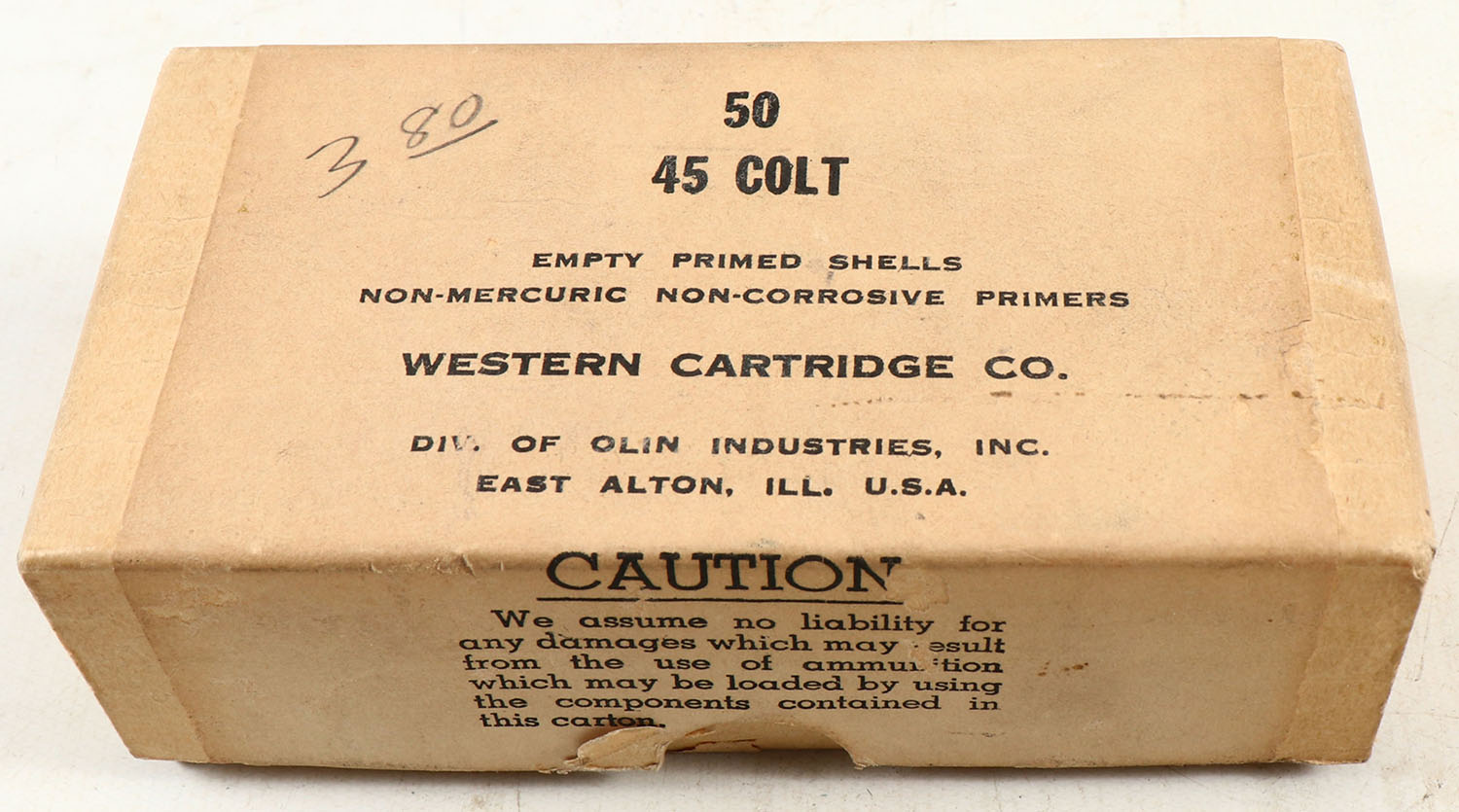 Western, 45 Colt, Empty Primed Shells, 1pc., Full, buff box with buff & black label, box & brass are excellent. Grade: Excellent ++ - Value: 20 to 60