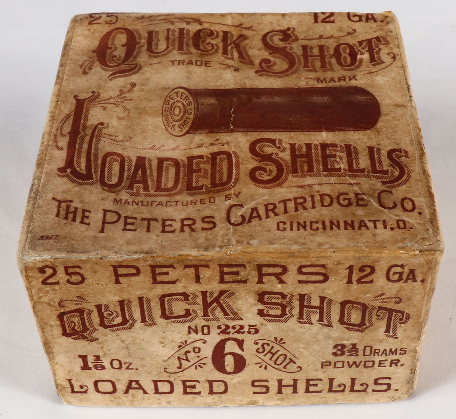 Peters, QUICK SHOT LOADED SHELLS, 12ga., 2pc., Empty, shot size 6, buff box with buff & red label, pictures large red shot shell on top, label is great, box has age soiling with light scuffing otherwise very solid, Very Rare & Hard to find box. Grade: Very Good ++ - Value: 1000 to 3000