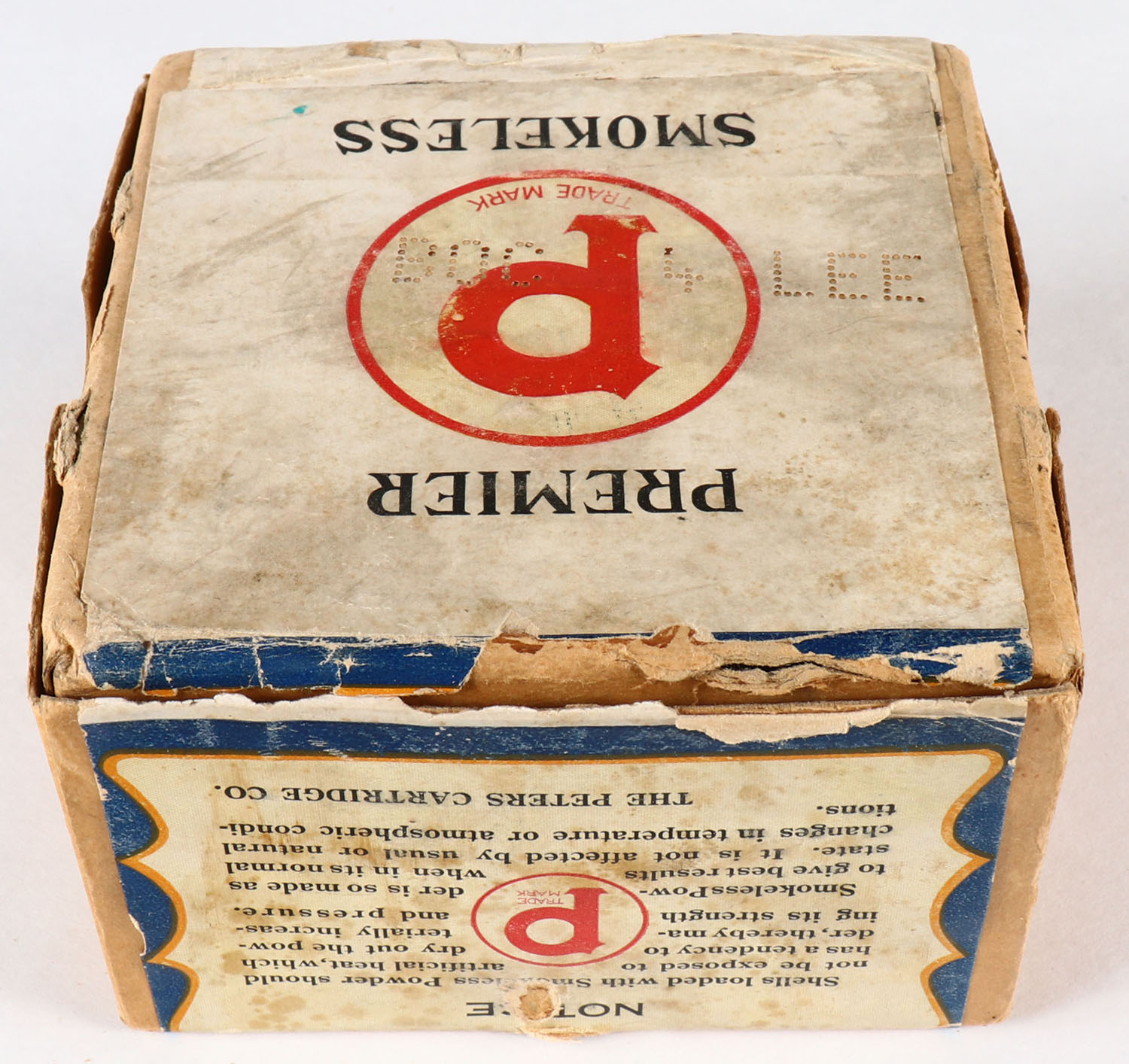 Peters Cart. Co. PREMIER, 12ga., 2pc., FULL, shot size 7 CH., buff box with multi colored label that pictures a flying Prairie Chicken, box has a seam split to top, has light age soiling & edge wear, paper shells are excellent. Grade: Very Good ++ - Value: 200 to 1000