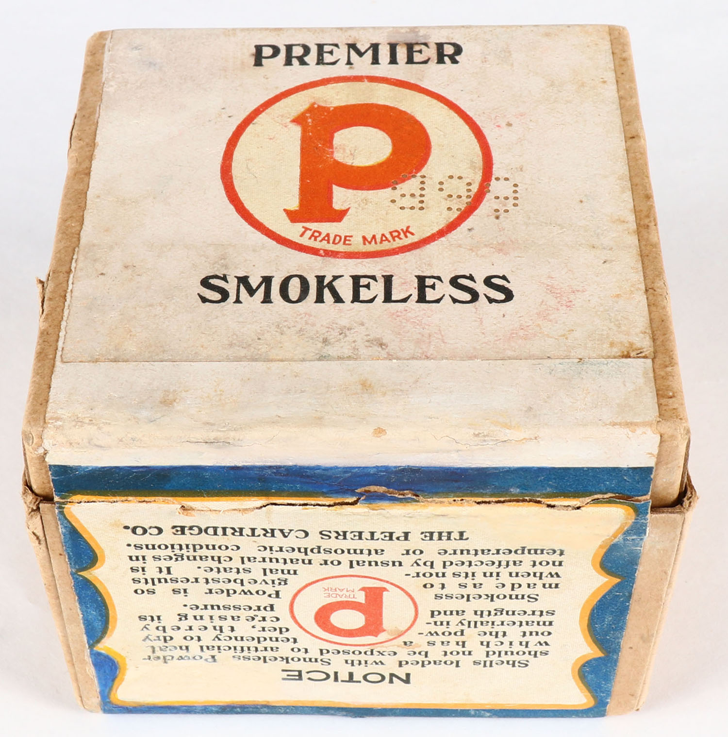 Peters Cart. Co. PREMIER, 20ga., 2pc., FULL & HALF SEALED, shot size 6 CH, buff box with multi colored label that pictures a flying Prairie Chicken, box has been lightly professionally touched up, has light age soiling. Grade: Excellent - Value: 500 to 2000