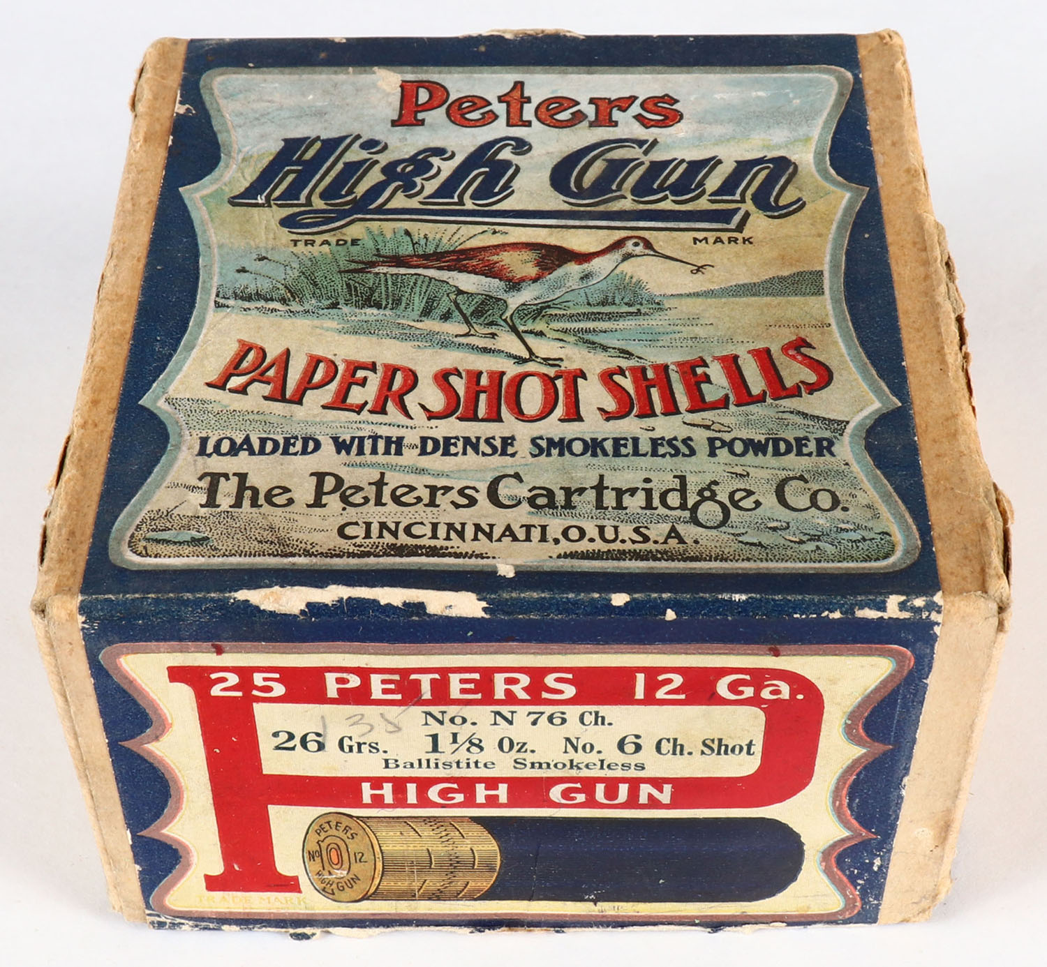 Peters Cart. Co., HIGH GUN, 12ga, 2pc., Empty, shot size 6 CH, buff box with multi colored picture of Snipe, Ballisite Smokeless, box is solid with light fading to top with edge wear, has incorrect bottom, picture of the correct bottom is one that has been printed off the computer and placed over the bottom of the box. Grade: Good ++ - Value: 100 to 500