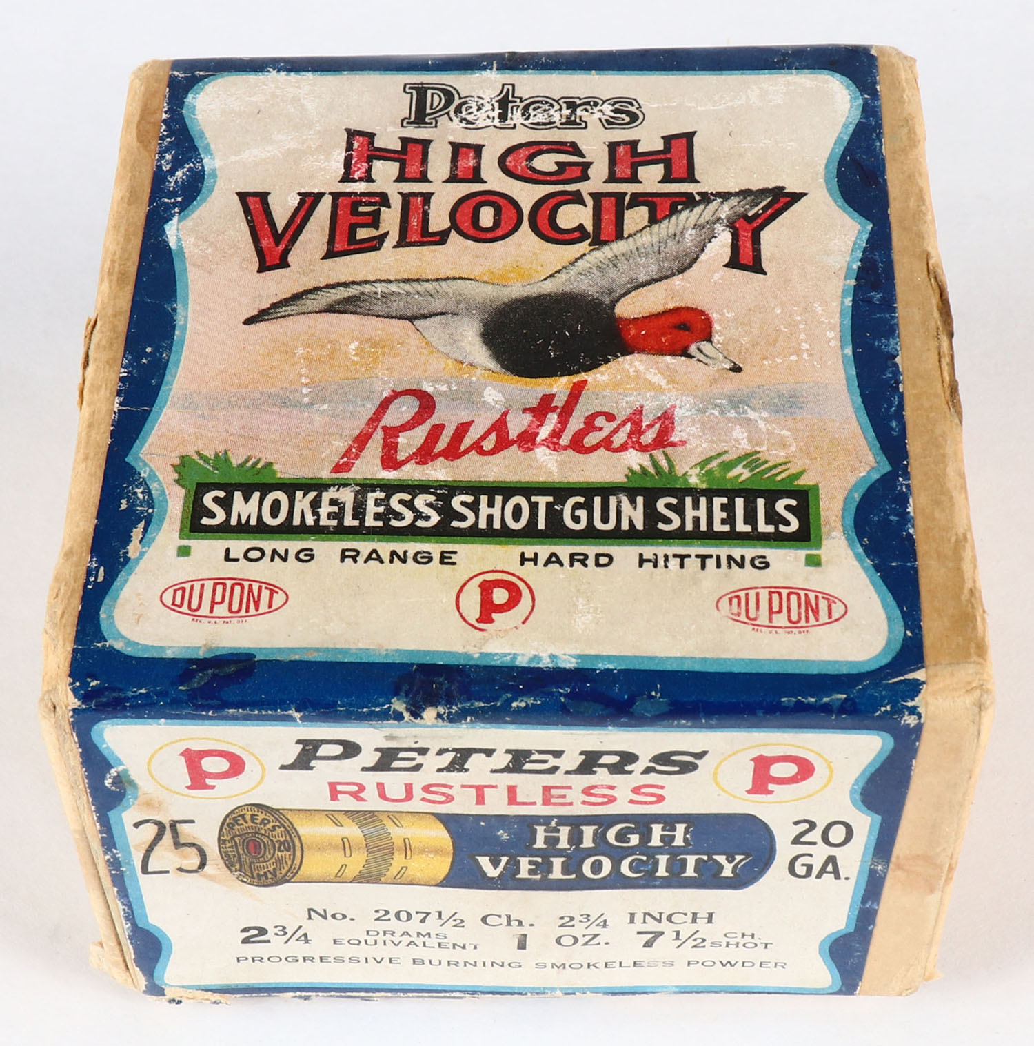 Peters Cart. Co., RED HEAD BOX, 20ga., 2pc., FULL, shot size 7 1/2 Chilled Shot, buff box with multi colored label that pictures RED HEAD in flight, 2 3/4'', Loading: No. 207 1/2 Ch., 2 3/4 Drams, 1 Oz., box has minor age soiling & light scuffing with great color to label, paper shells are excellent. Grade: Very Good ++ - Value: 500 to 2500