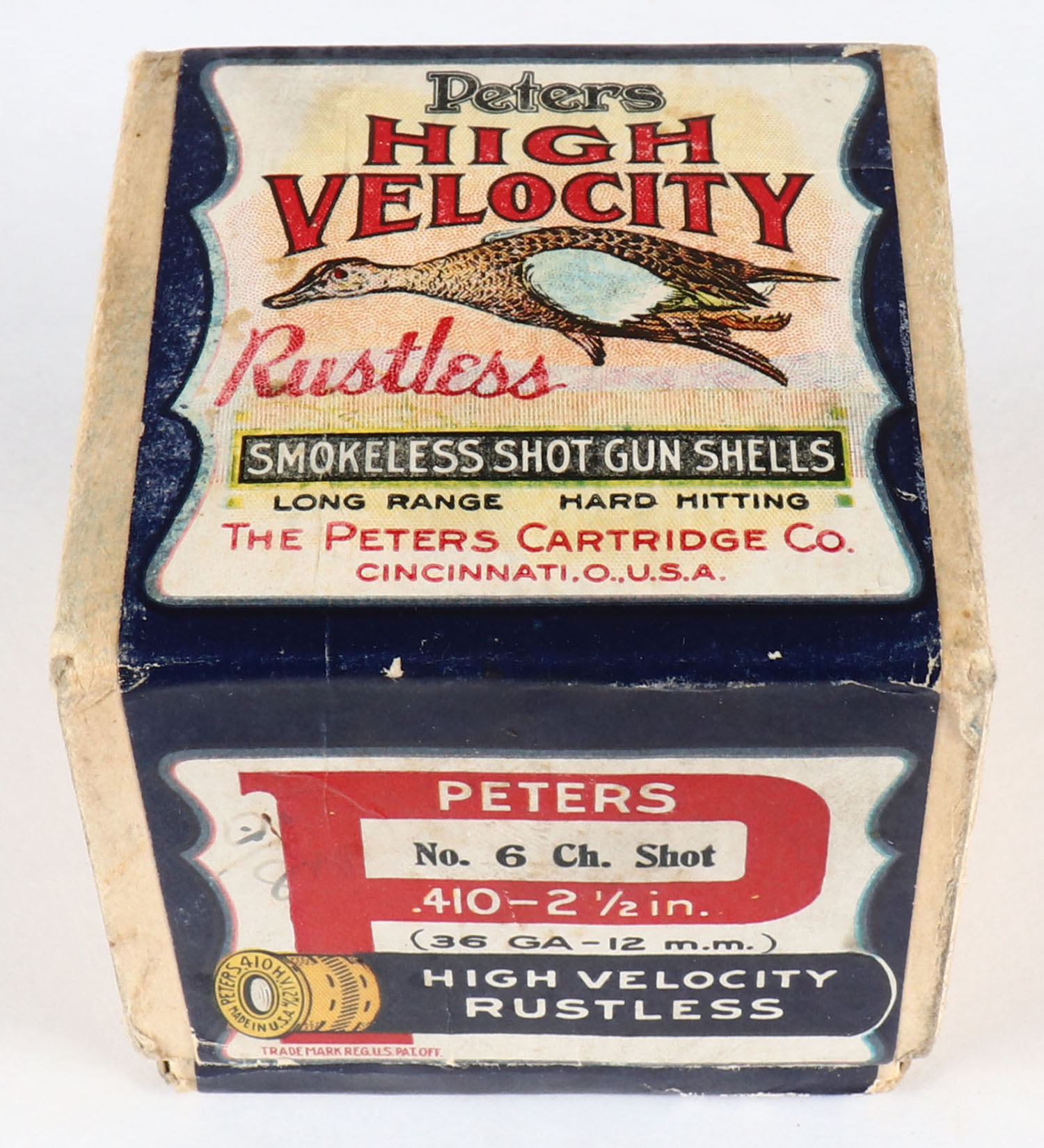 Peters Cart. Co., Blue Wing Teal, 410ga., 2 1/2'', 2pc., Empty, shot size 6CH, buff box with multi colored label that pictures Blue Wing Teal in flight, box is very solid with very good label, has light scuffing. Grade: Excellent - Value: 200 to 500