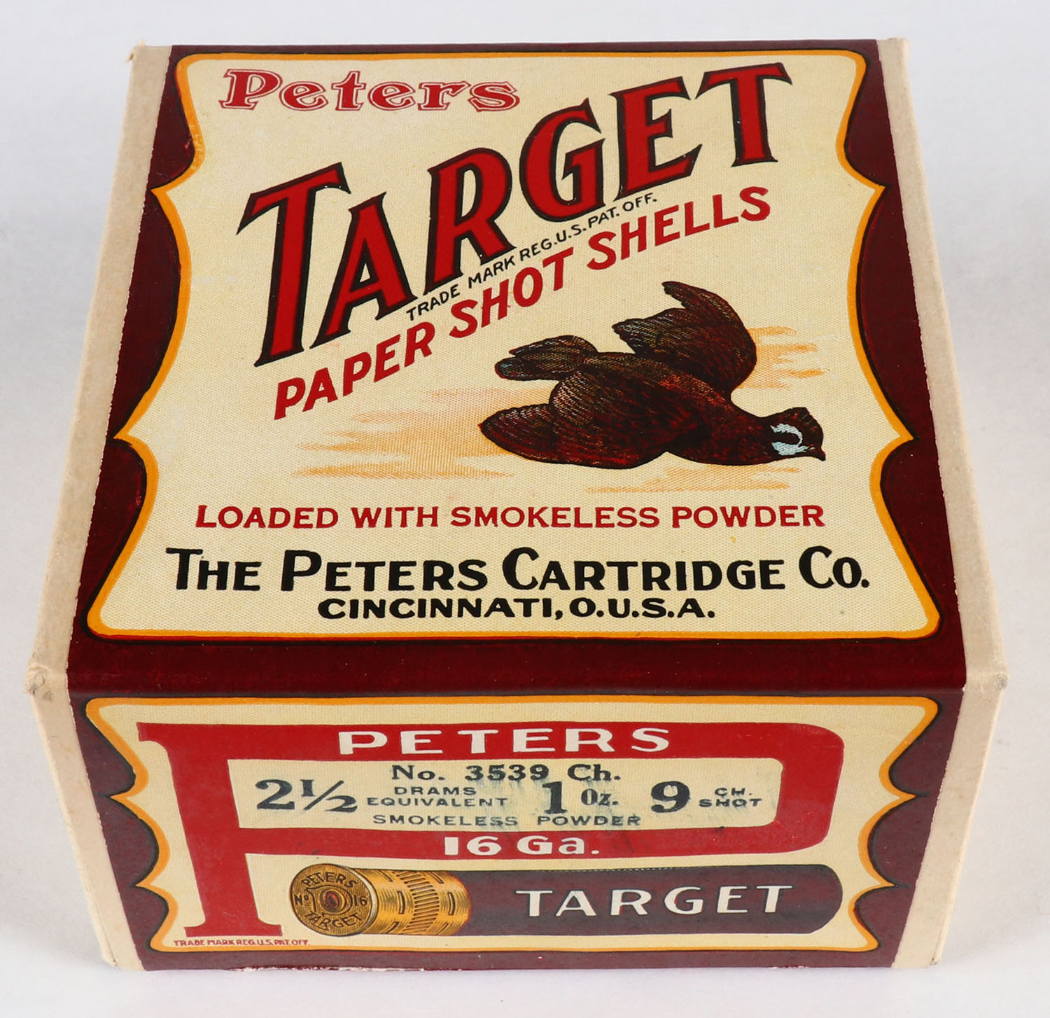 Peters Cart. Co., TARGET, 16ga., 2pc., FULL & SEALED shot size 9CH Shot, buff box with multi-colored label with Quail in flight, box is very solid with excellent label. Grade: Excellent ++ - Value: 100 to 1000