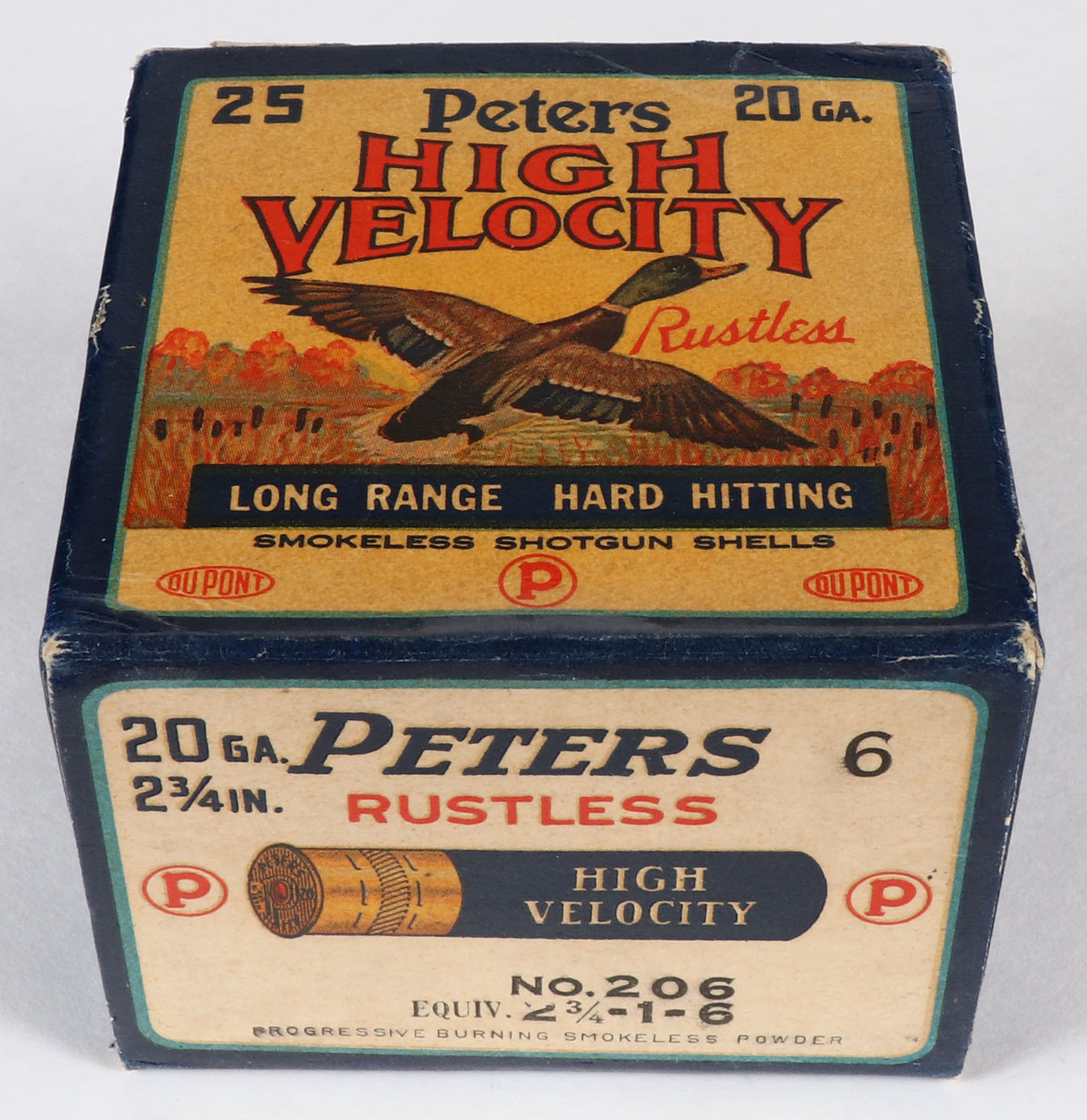 Peters Cart. Co., Bridgeport, CT, High Velocity, 20ga., 1pc., Full, shot size 6, multi colored box that pictures mallard flying out of the marsh grass, box is very solid with excellent colors, has very minor edge wear, paper shells are excellent. Grade: Excellent - Value: 40 to 100