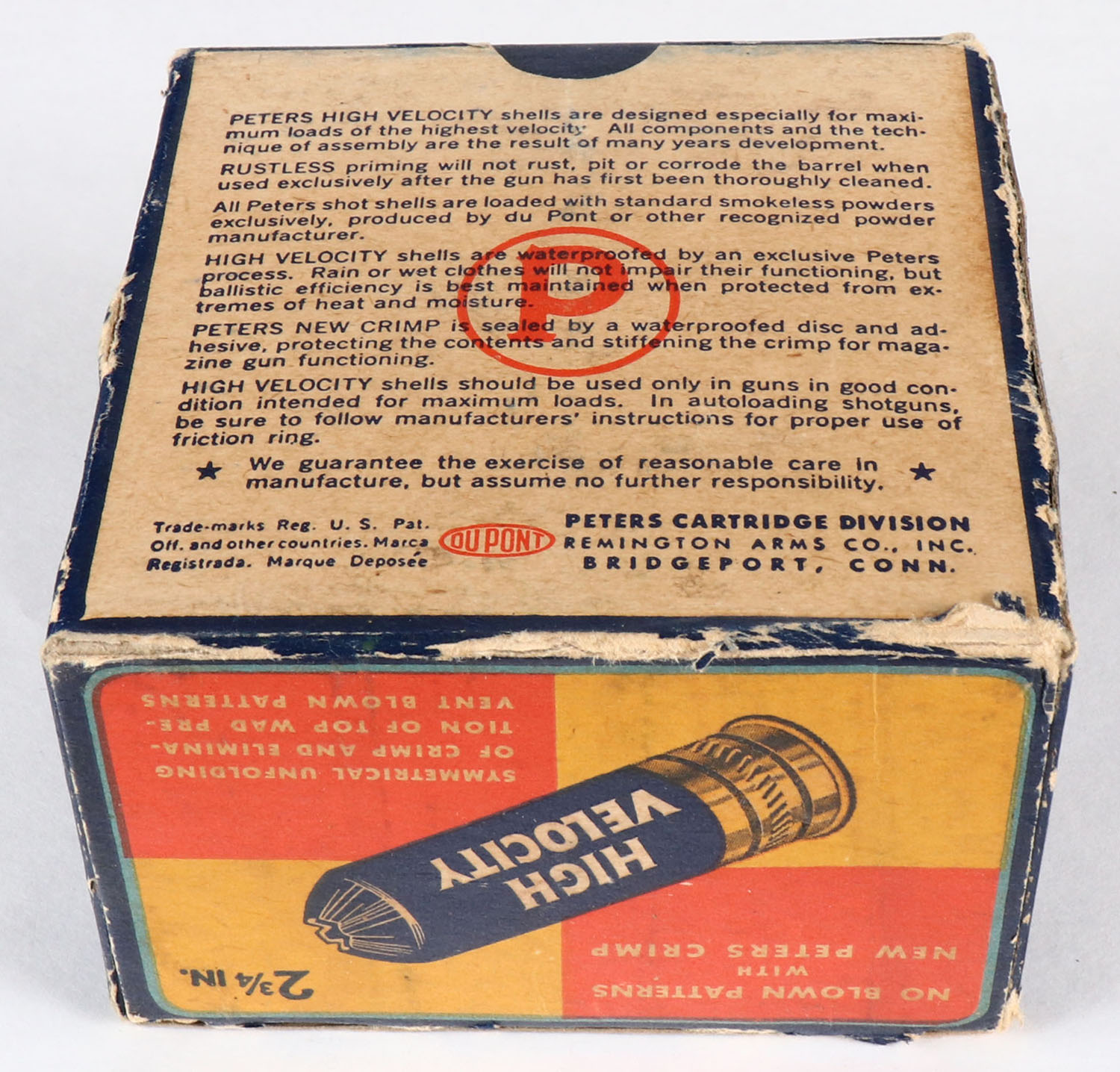 Peters Cart. Co., High Velocity, New Peters Crimp, 16ga., 1pc., Full, shot size 7 1/2, multi colored box that pictures mallard flying out of the marsh grass, box has age soiling with edge wear, paper shells are excellent. Grade: Very Good - Value: 20 to 100