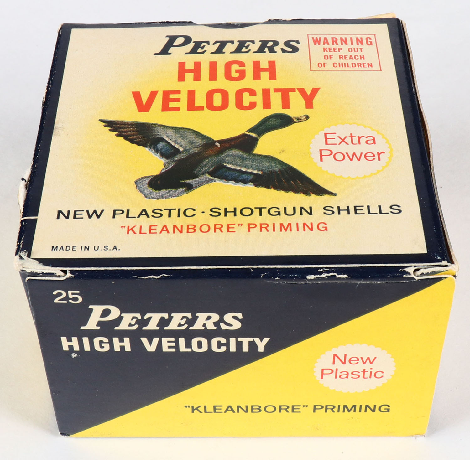 Peters, High Velocity, 16ga, 2 3/4'', 1pc., Full, shot size Riffled Slugs, multi colored box that pictures mallard flying, box is solid with great color, plastic shells are excellent. Grade: Excellent - Value: 10 to 40