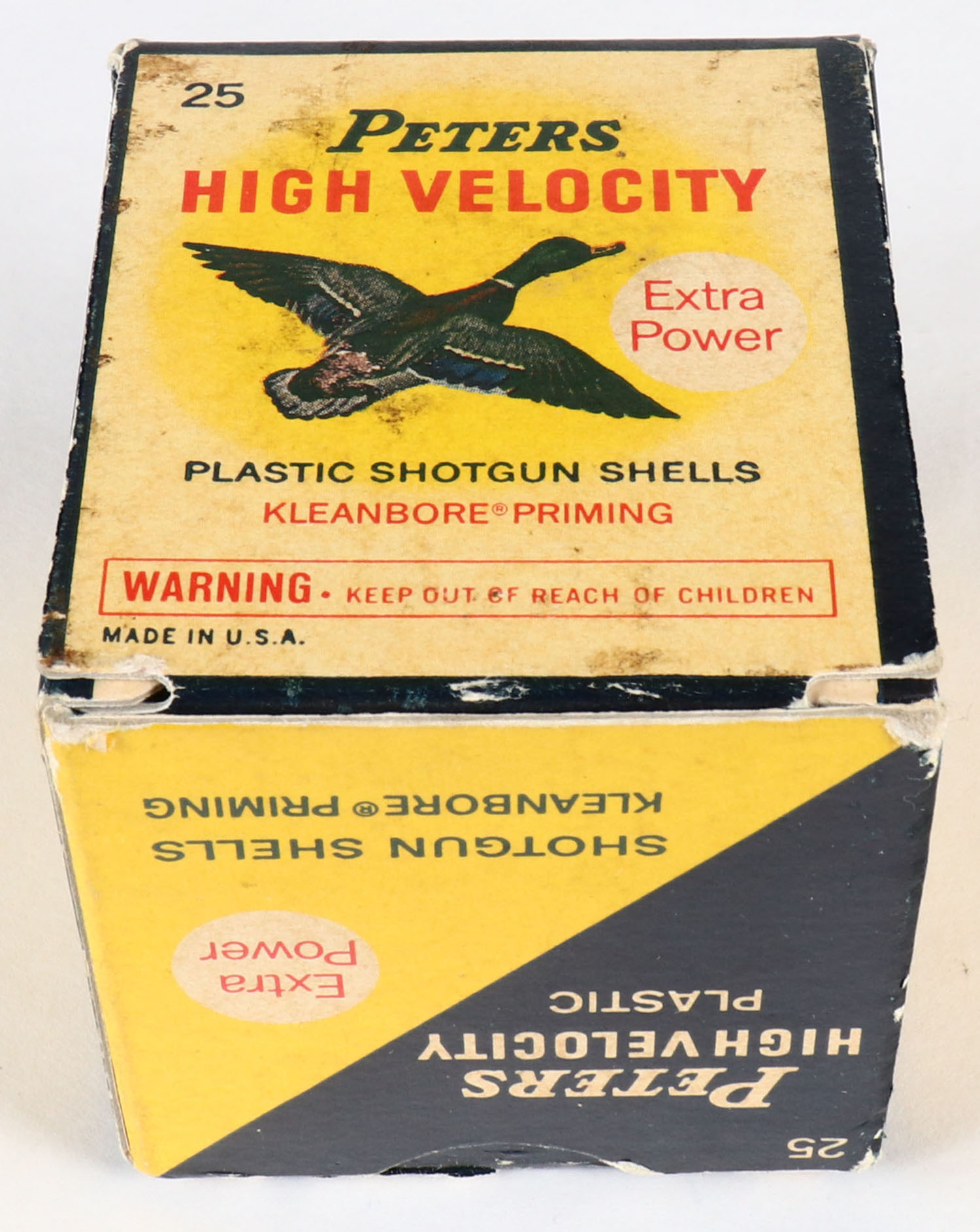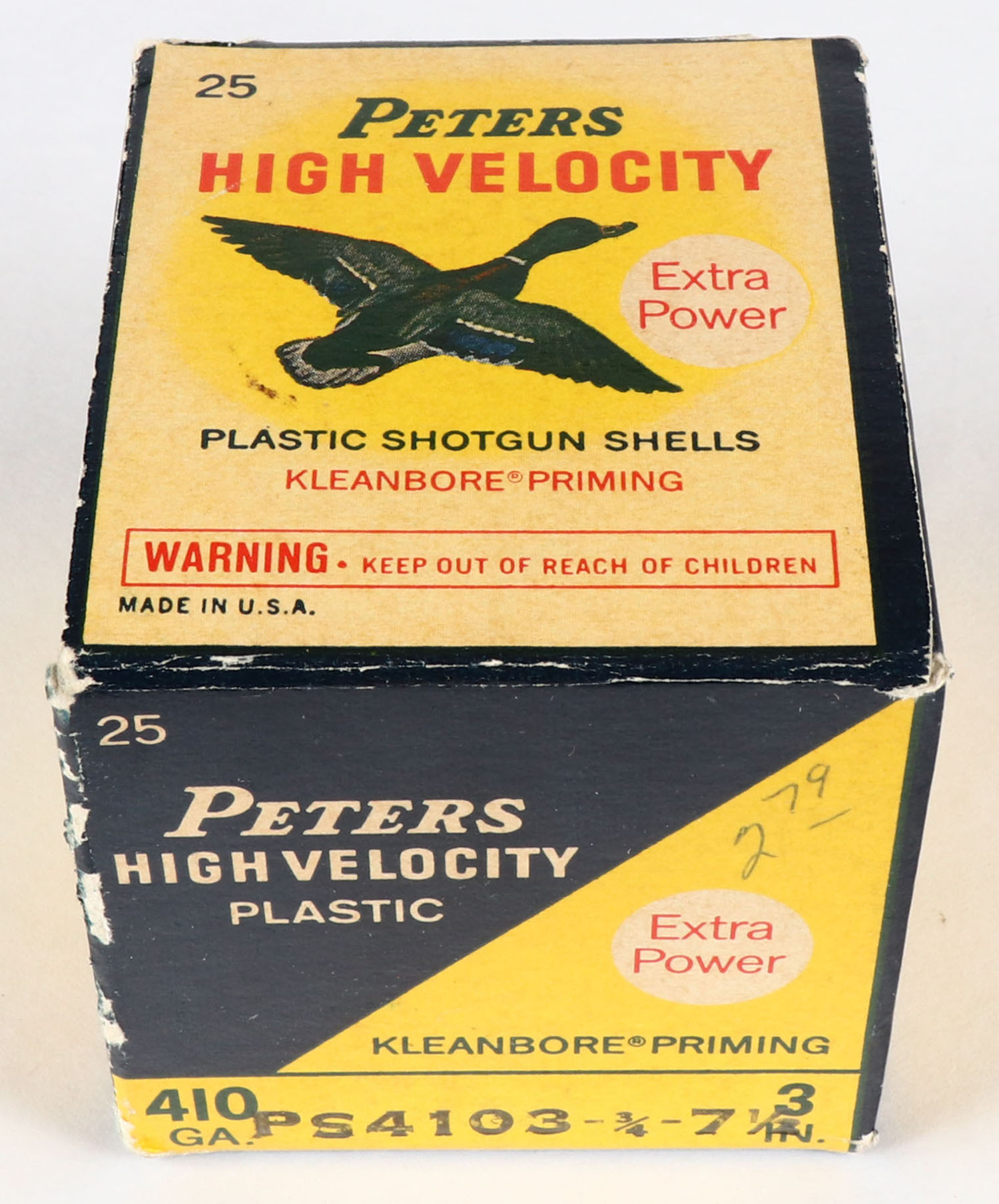 Peters Cart. Co., High Velocity, 410ga, 3'', 1pc., Full, shot size 7 1/2, multi colored box that pictures mallard flying, box is solid with great color, has light age soiling, plastic shells are excellent. Grade: Very Good ++ - Value: 10 to 40