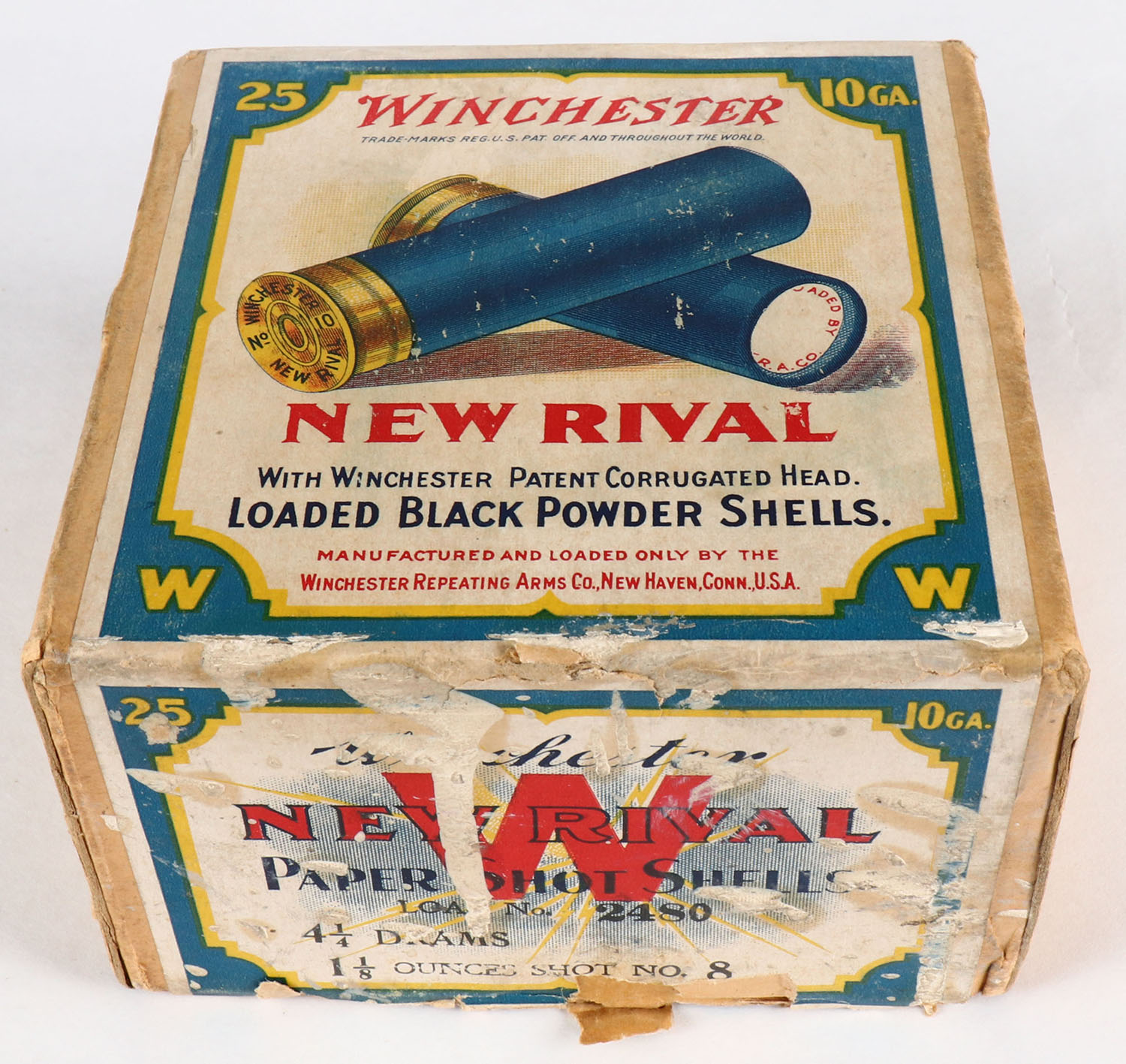 Winchester, NEW RIVAL, 10 GAUGE, 2pc., FULL & HALF SEALED, Shot Size 8, buff box with multi-colored label that pictures the two crossed shells, loaded BLACK POWDER shells, Box is solid with paint on one side of box, has very nice colors to label. Grade: Very Good ++ - Value: 200 to 800