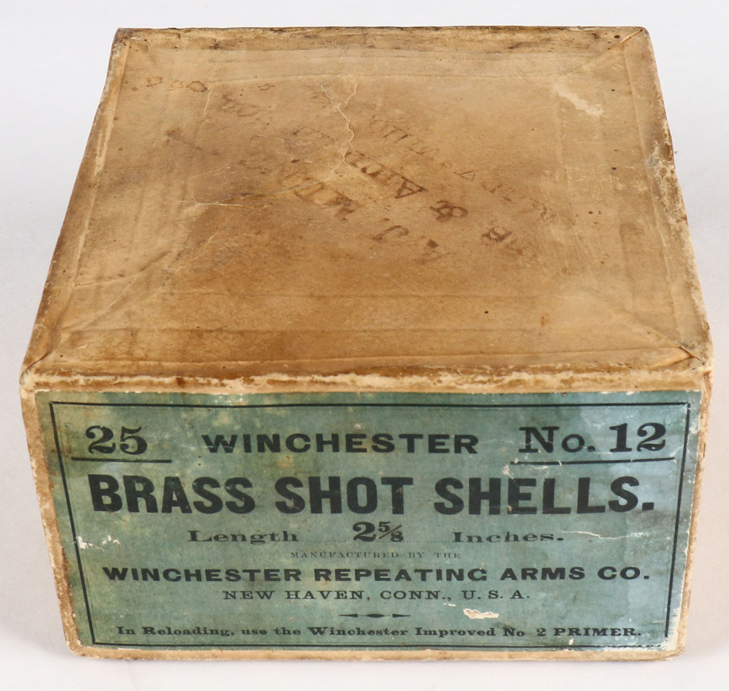 Winchester, BRASS SHOT SHELLS, 12ga., 2pc., Empty, 2 5/8'', buff box with blue & black label, box is solid with age soiling & scuffing. Grade: Very Good - Value: 20 to 100