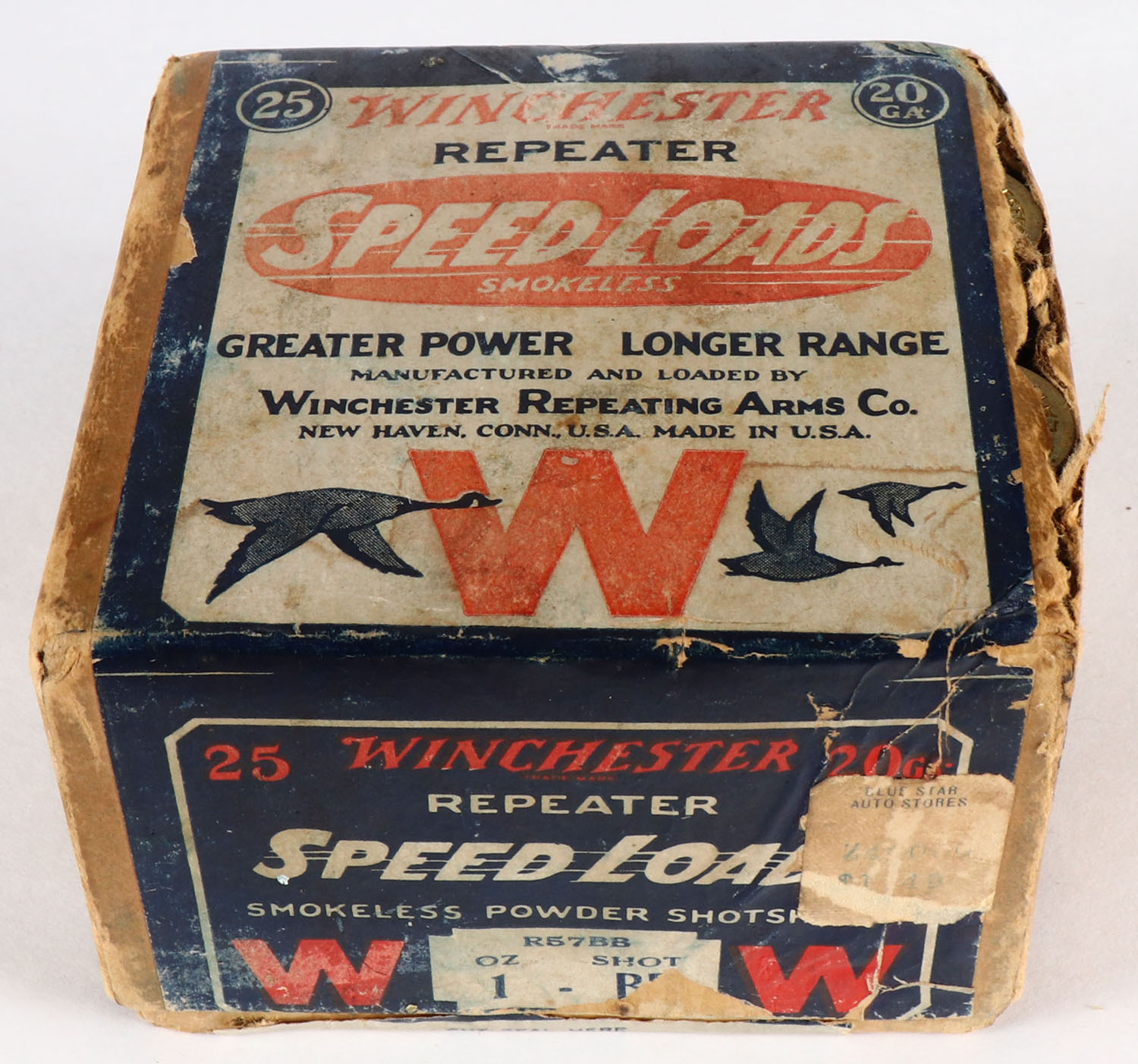 Winchester REPEATER Speed Loads, 20ga., 2pc., FULL, shot size BB, buff box with dark blue red & white paper label, box has soiling & scuffing with seam splits, RARE with the REPEATER markings, paper shells are excellent. Grade: Very Good - Value: 100 to 400