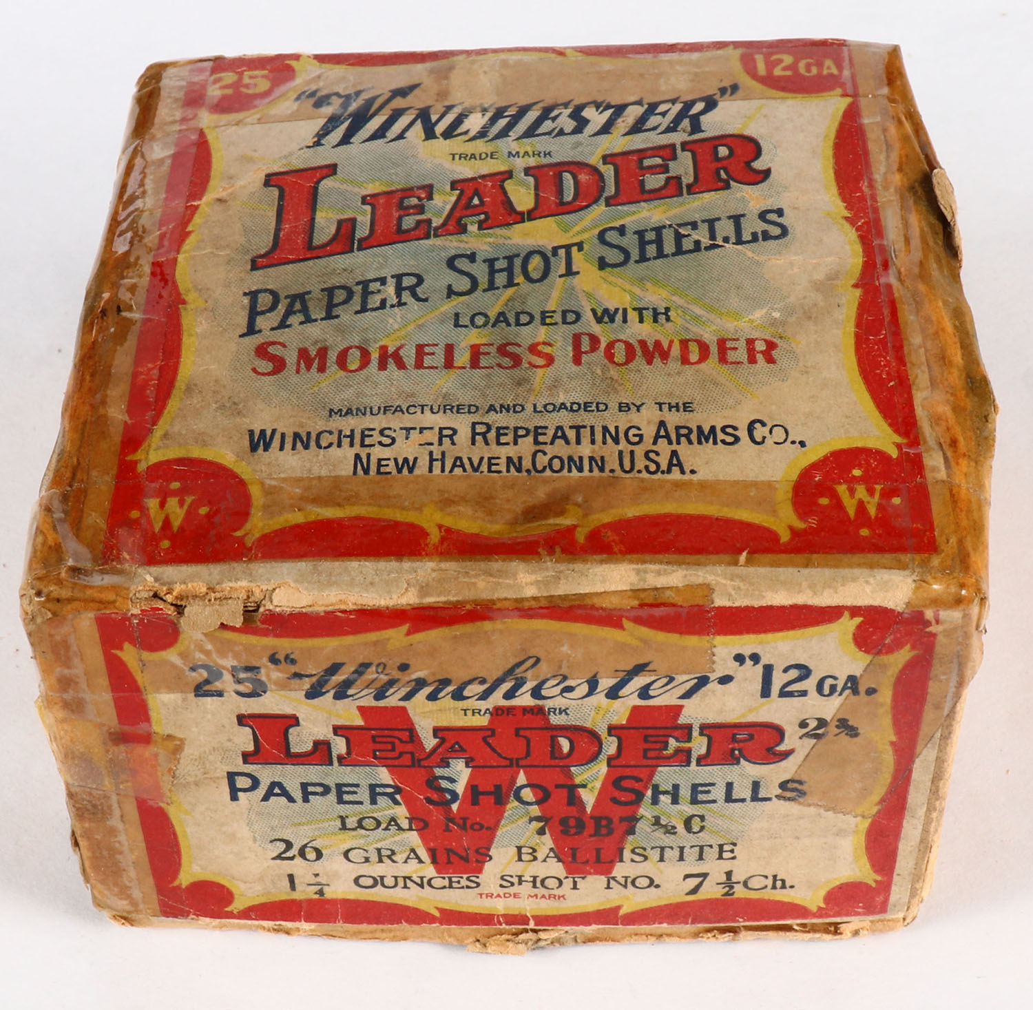 Winchester, LEADER, 12ga, 2pc., Full of incorrect shot sizes, shot size 7 1/2CH, Buff box with red, yellow, white & black label showing lightning bolt, box has seam splits with tape repairs, box has soiling & scuffing, shells are good. Grade: Good - Value: 30 to 90