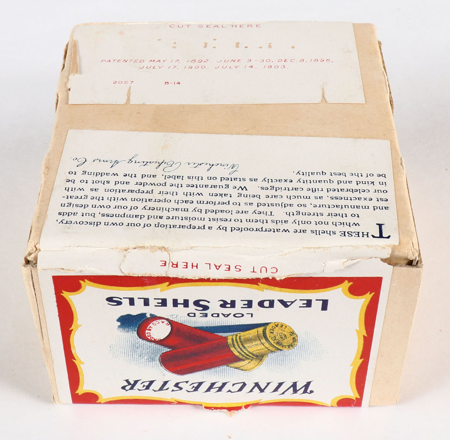Winchester, LEADER, 20ga, 2pc., FULL & SEALED, shot size 7 1/2CH, Buff box with red, yellow, white & black label showing lightning bolt, box is very solid with great color to label. Grade: Excellent ++ - Value: 200 to 800