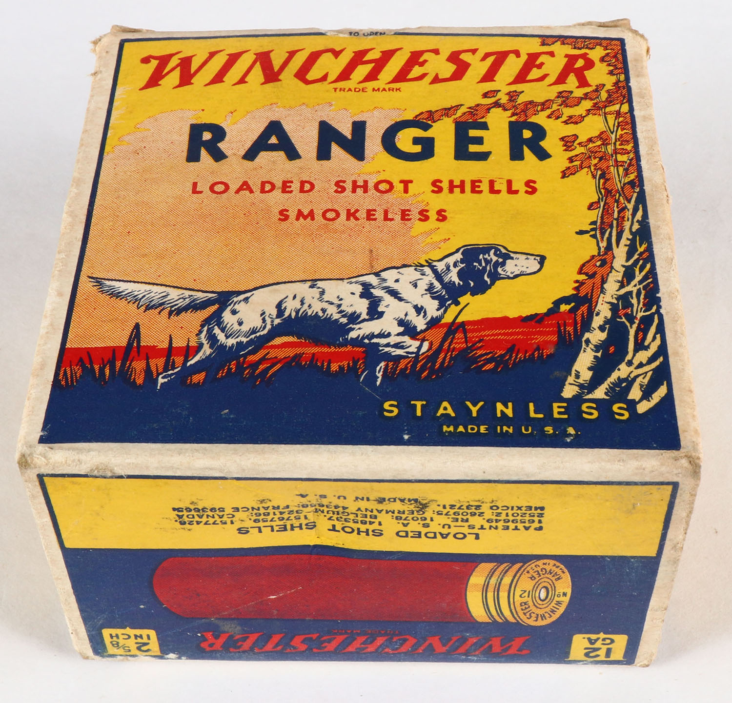 Winchester, Ranger, 12ga, 1pc., Partial 23rds, Shot Size 4 Chilled, multi colored box, dog on point, 2 5/8'', box has age soiling & scuffing with very nice colors, shells are very good. Grade: Very Good ++ - Value: 20 to 100