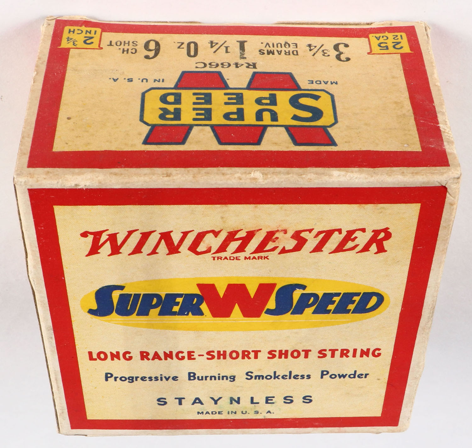 Winchester, Super W Speed, 12ga., Staynless, 2 3/4 in., 1pc., Full, shot size 6CH, cream red, blue and yellow box, box is very solid with great colors, paper shells are excellent. Grade: Excellent ++ - Value: 20 to 60