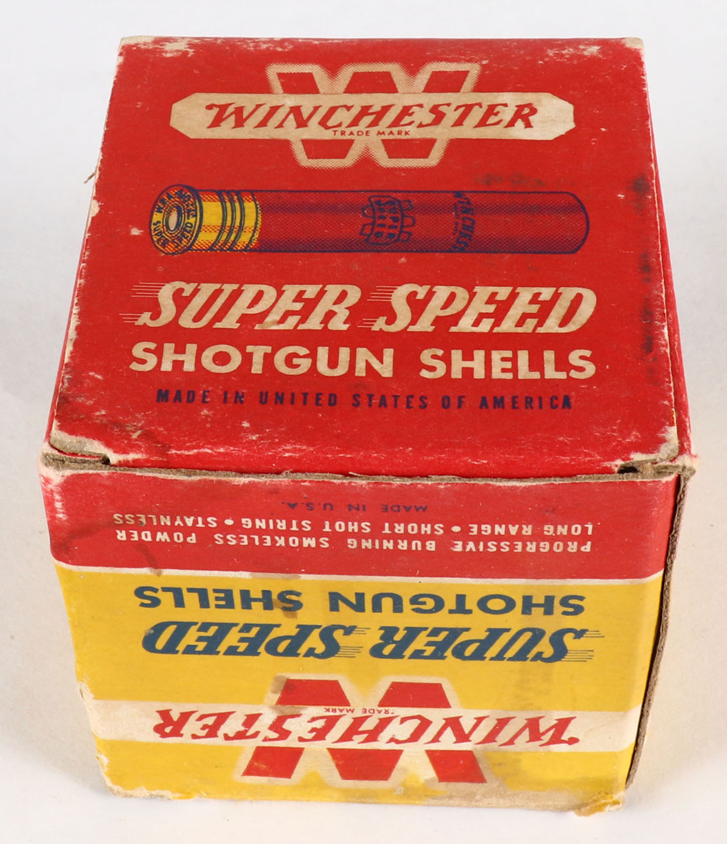 Winchester, Super Speed, 410ga., 2 1/2'', 1pc., Full, shot size 9, Skeet Load, red, black and yellow box, box has soiling with scuffing, paper shells are very good. Grade: Very Good - Value: 10 to 30