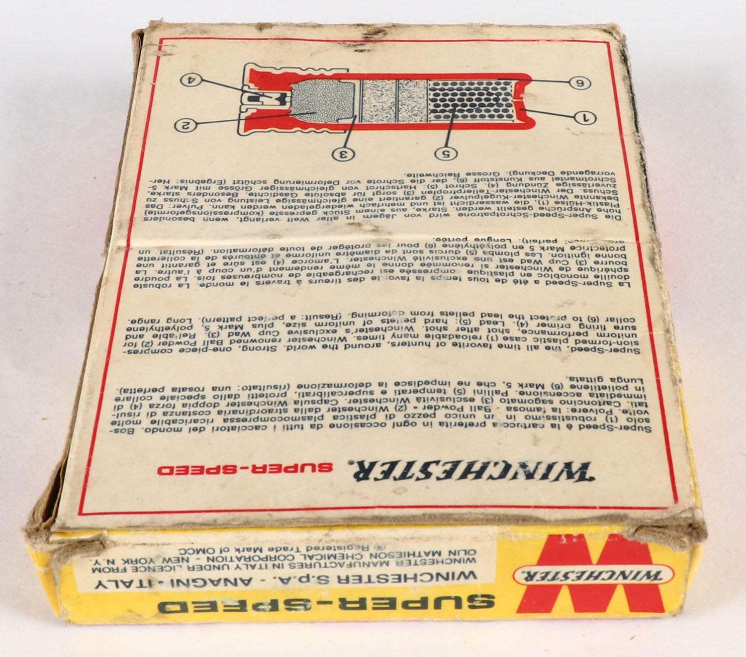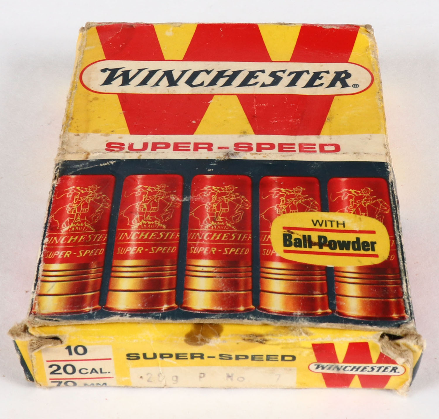 Winchester, Super Speed, 20ga, 1pc., Full, White, blue & red box, shot size 9, box has soiling, plastic shells are very good. Grade: Good ++ - Value: 8 to 20