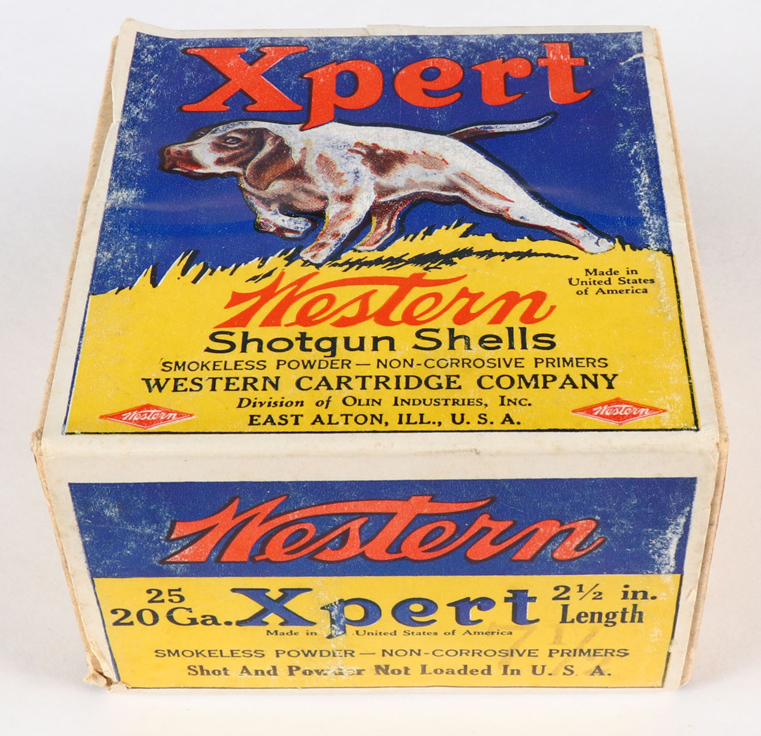 Western, Xpert, 20ga., 2pc., FULL and SEALED, shot size 7 1/2, buff box with blue and yellow paper label that pictures the pointer dog on top, box is very solid has light age soiling with great colors. Front of box says ''Shot and Powder Not Loaded In U.S.A'' but says ''Made In United States Of America'' on top of box, loaded in Mexico. Grade: Excellent ++ - Value: 50 to 200