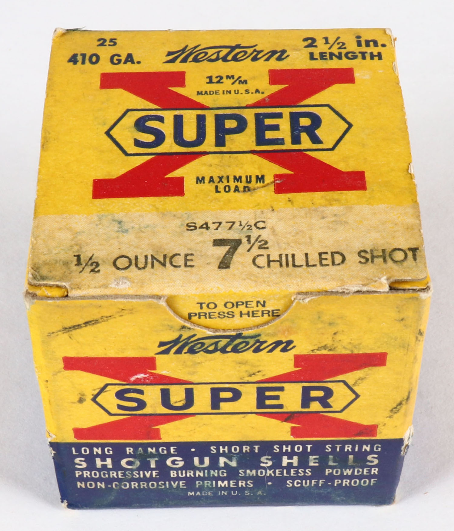 Western, Super X, 410ga., 1pc., Full, shot size 7 1/2 CH, 2 1/2'', multi-colored box, box has minor soiling with very nice colors, shells are excellent. Grade: Very Good ++ - Value: 10 to 40