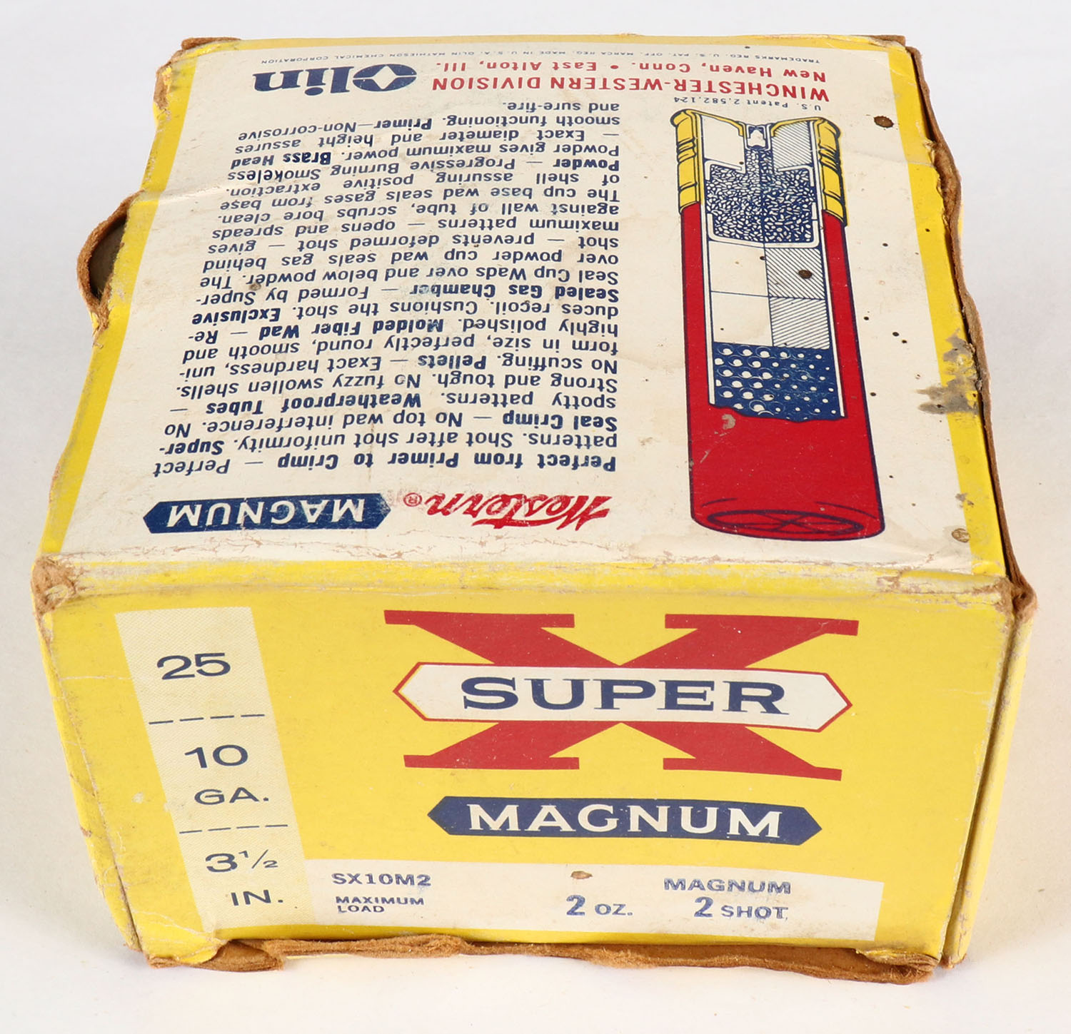 Western, Super X, 10ga., 3 1/2'', 1pc., Full, shot size 2 Magnum, yellow, blue & red box, box has shell protrusions with excellent colors, paper shells are excellent. Grade: Very Good ++ - Value: 20 to 60
