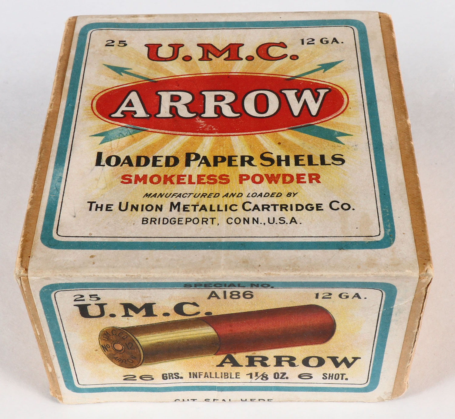 UMC, ARROW, 12ga., 2pc., Empty, shot size 6, buff box with sunburst logo & multi-colored label, box has very light edge wear with great colors, box has writing on side. Grade: Excellent - Value: 40 to 150