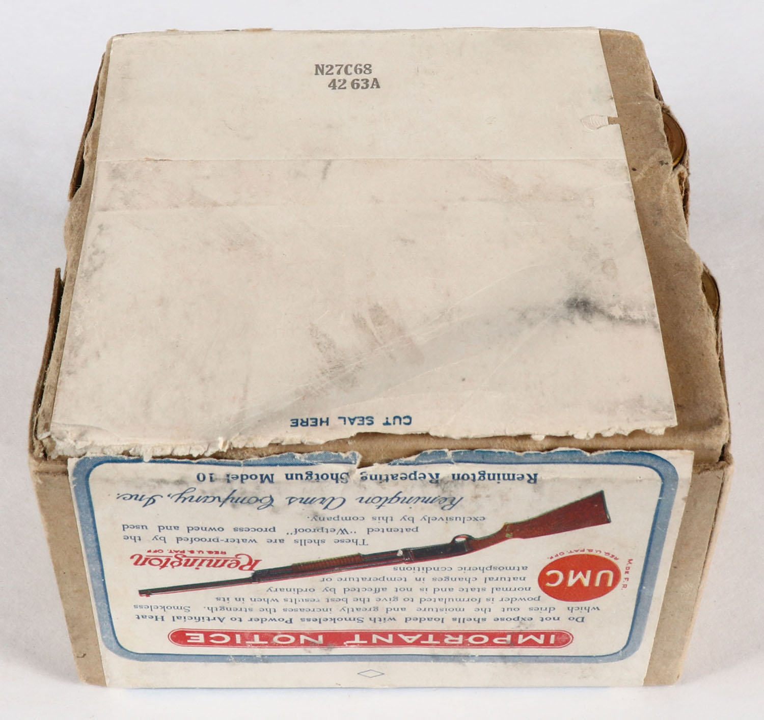 REM-UMC, ARROW, 12ga., 2pc., FULL, shot size 5 CH, buff box with sunburst logo & multi-colored label, box has light soiling with light shell protrusion, paper shells are very good. Grade: Very Good ++ - Value: 60 to 200