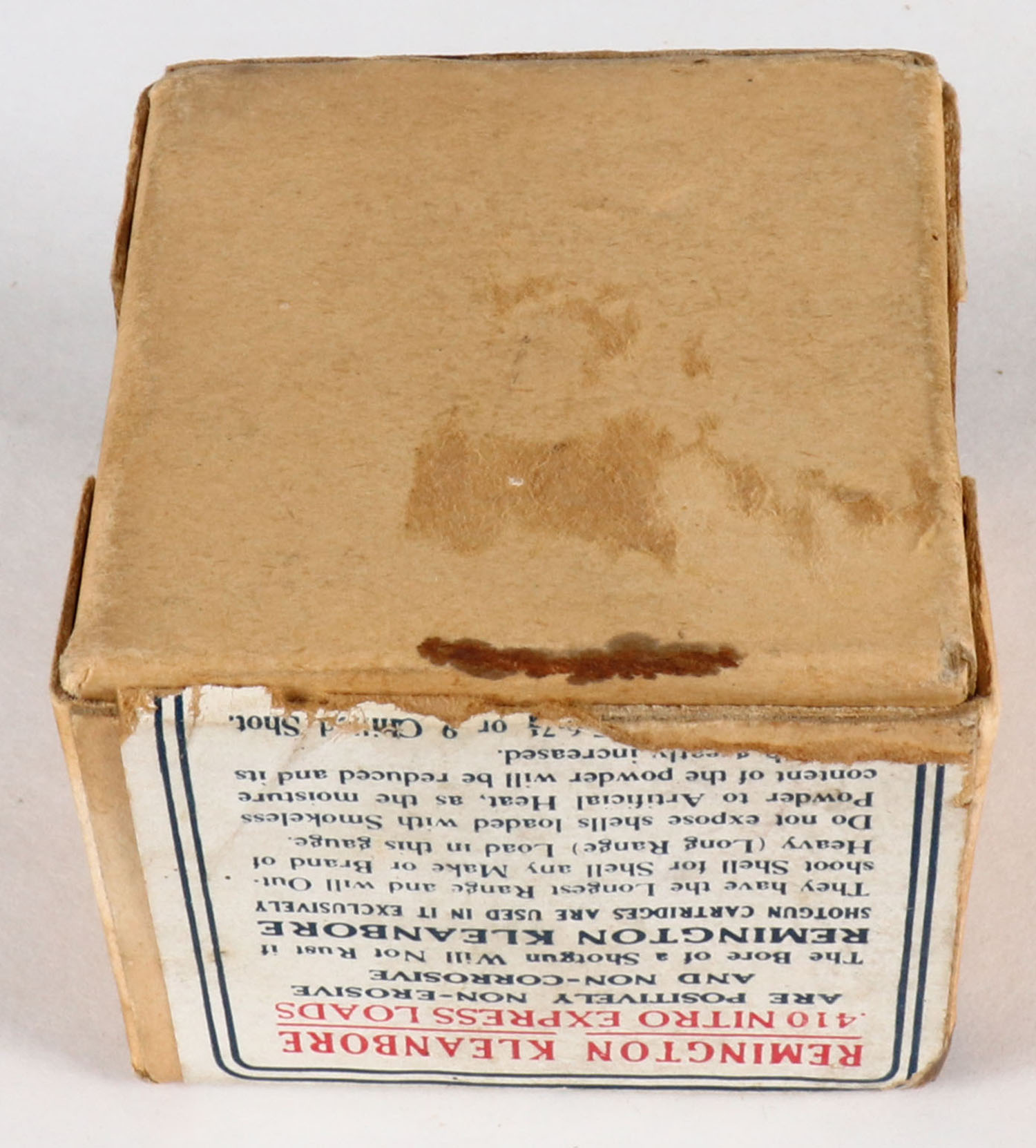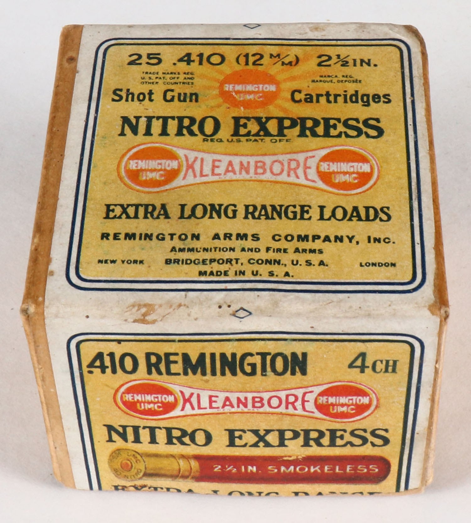 Remington UMC, Nitro Express, 410ga, 2pc., Empty, shot size 4CH, buff box with sunburst logo, box has light scuffing with very nice color to label. Grade: Very Good + - Value: 40 to 100