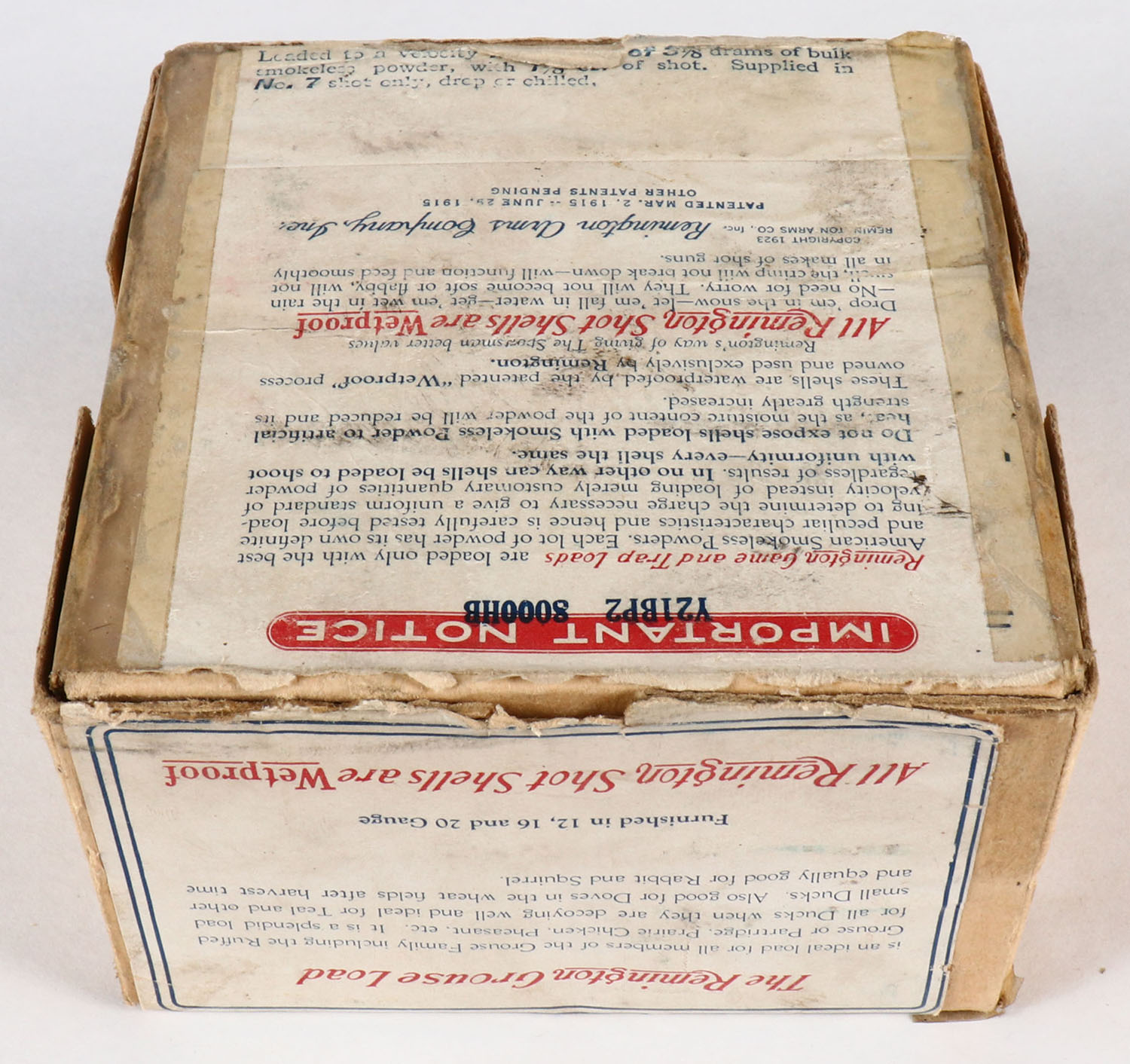 Remington UMC Nitro Club, GAME LOADS, GROUSE LOAD, 12ga., 2pc., Partial 3rds., shot size 7CH., buff box with sunburst logo & Ruffed GROUSE on side, box has tape repairs to seams, scuffing and light age soiling, paper shells are excellent. Grade: Very Good + - Value: 100 to 400