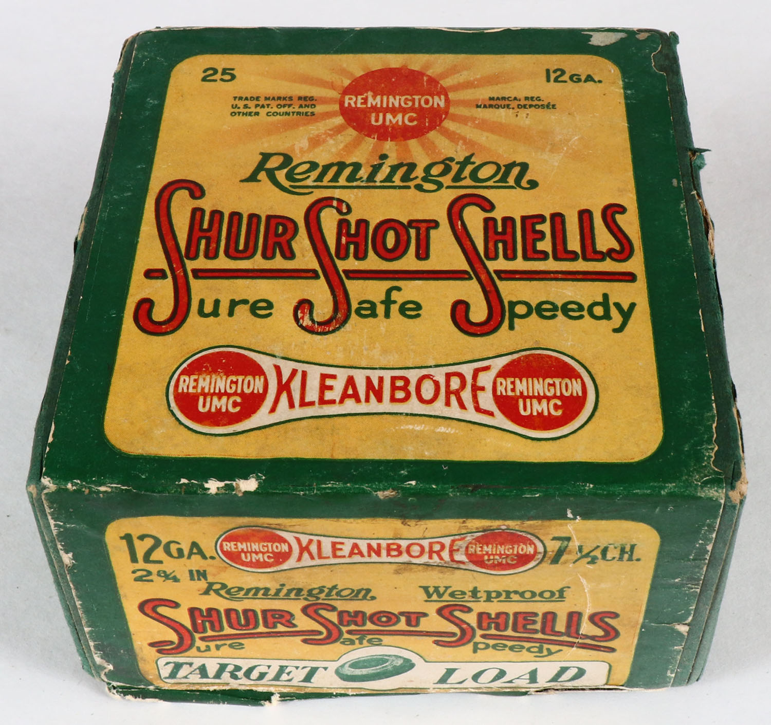 Remington UMC, Shur Shot Shells, TARGET LOAD, 12ga., 2pc., FULL & SEALED, shot size 7 1/2 CH, green box with green, yellow & red paper label, box has edge wear & light soiling, has light shell protrusions to bottom. Grade: Very Good ++ - Value: 100 to 300