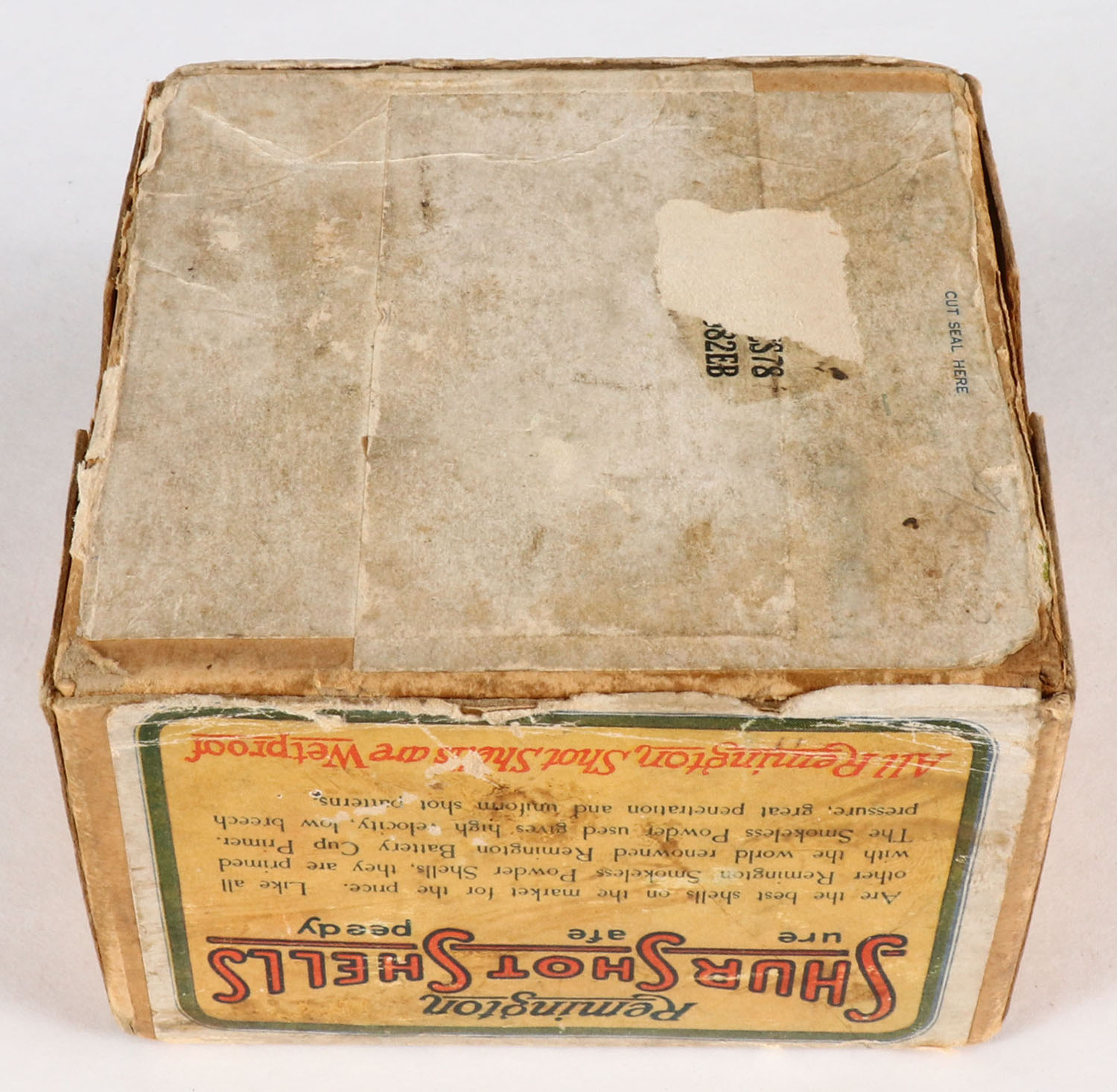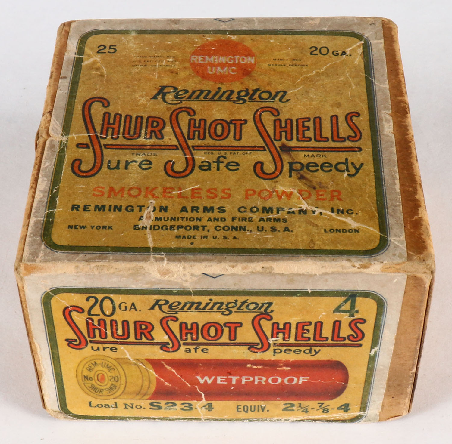 Remington UMC, Shur Shot Shells, 20ga., 2pc., Empty, shot size 4, Buff box with cream, green, red & orange paper label, box has age soiling & scuffing with edge wear. Grade: Good ++ - Value: 20 to 60