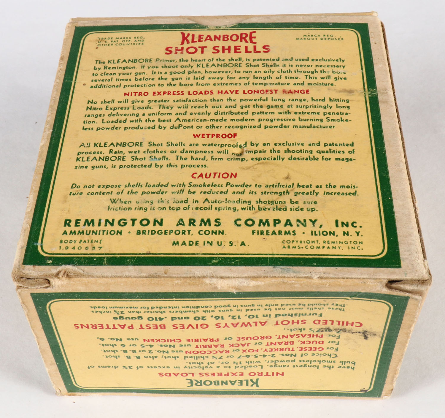 Remington, Kleanbore, NITRO EXPRESS, U.S. Property, 12ga., 2 3/4'', 1pc., Full, shot size 4C, box is buff, yellow, red and green, box is very solid with very nice colors, shells are very good. Grade: Very Good ++ - Value: 20 to 60