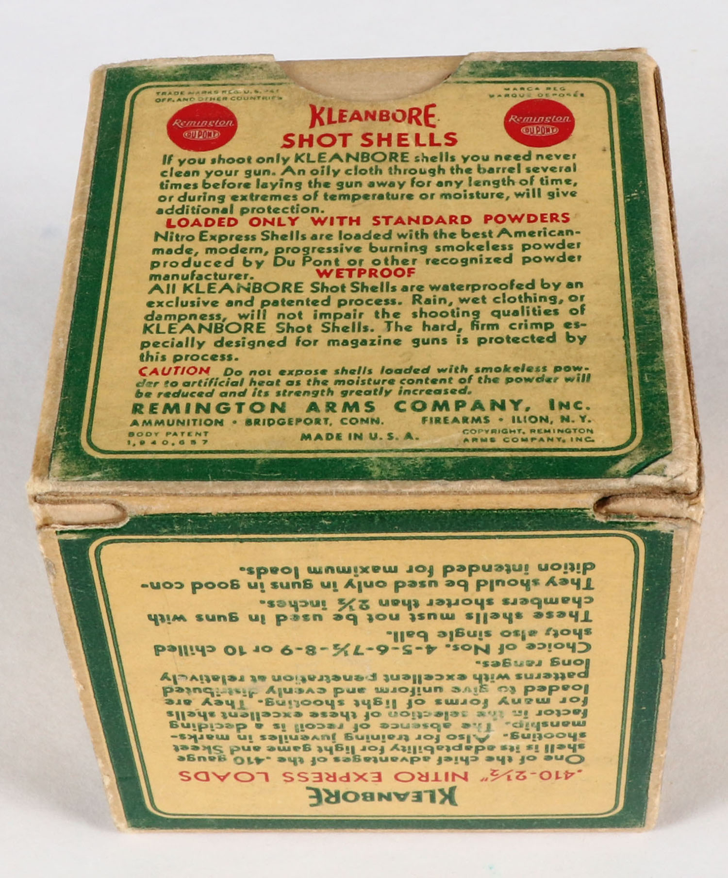 Remington, Kleanbore, NITRO EXPRESS, 410ga., 2 1/2'', 1pc., Full, shot size 1/5 Oz. BALL, box is buff, yellow, red and green, box has light scuffing with great colors, shells are excellent. Grade: Very Good ++ - Value: 20 to 60