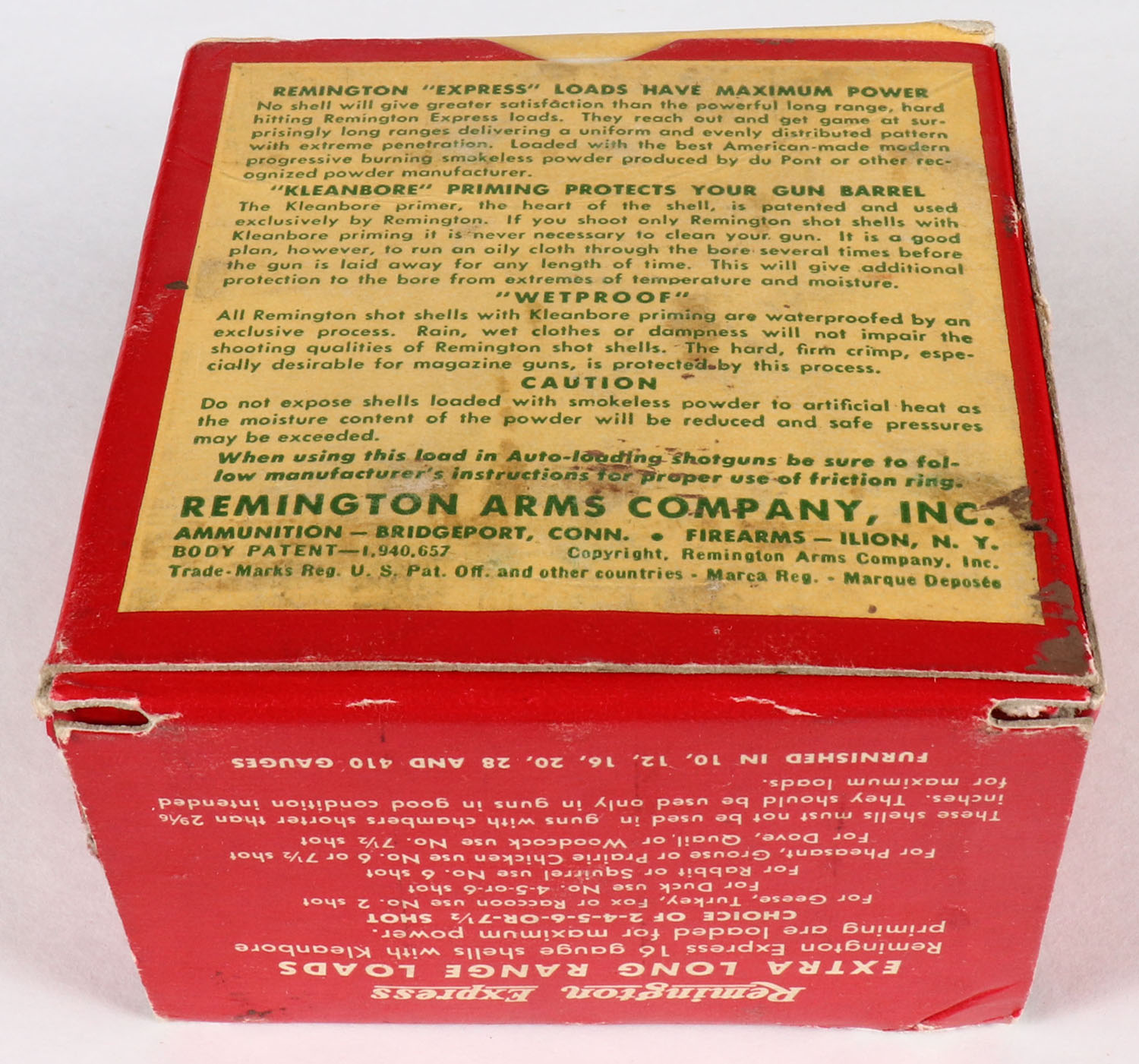 Remington Express, Extra Long Range, 16ga., 1pc., Full, shot size 7 1/2, 2 9/16'', red, white and green box, box is solid with light edge wear, shells are very good. Grade: Very Good ++ - Value: 10 to 30