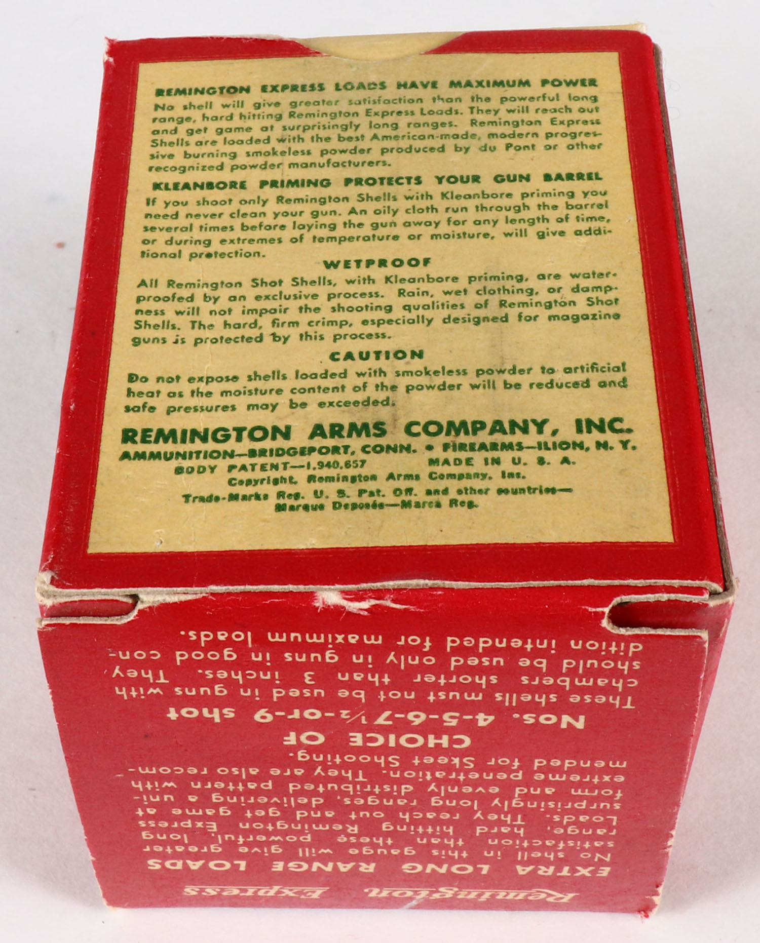 Remington Express, Extra Long Range, 410ga., 3'', 1pc., Full, shot size 6, box is white, yellow, red and green, box is very solid with excellent colors, shells are excellent. Grade: Excellent ++ - Value: 10 to 50
