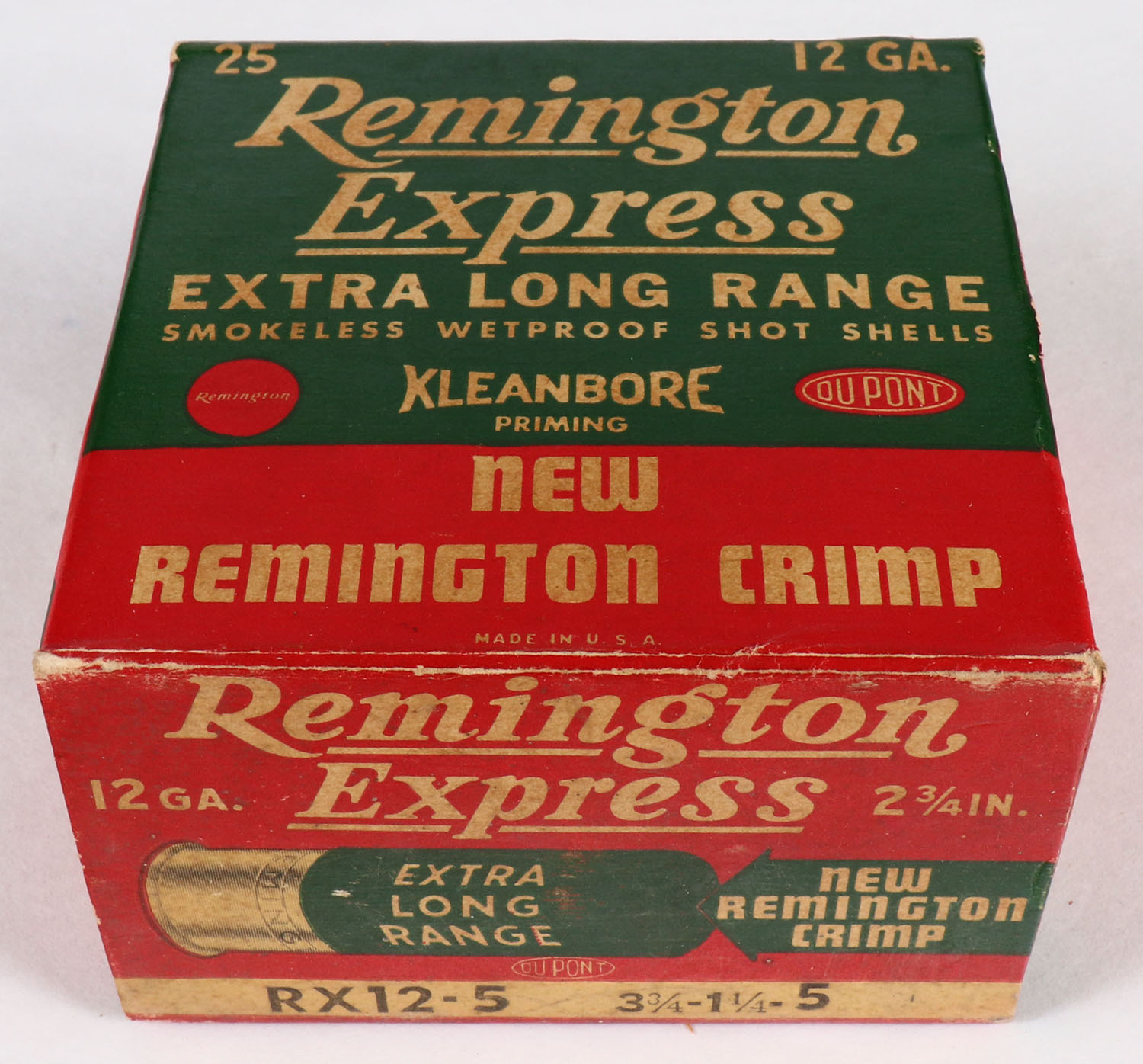 Remington Express, Extra Long Range, 12ga., 2 3/4'', 1pc., Full, shot size 5, box is white, yellow, red and green, box is very solid with very nice colors, shells are excellent. Grade: Excellent ++ - Value: 10 to 40