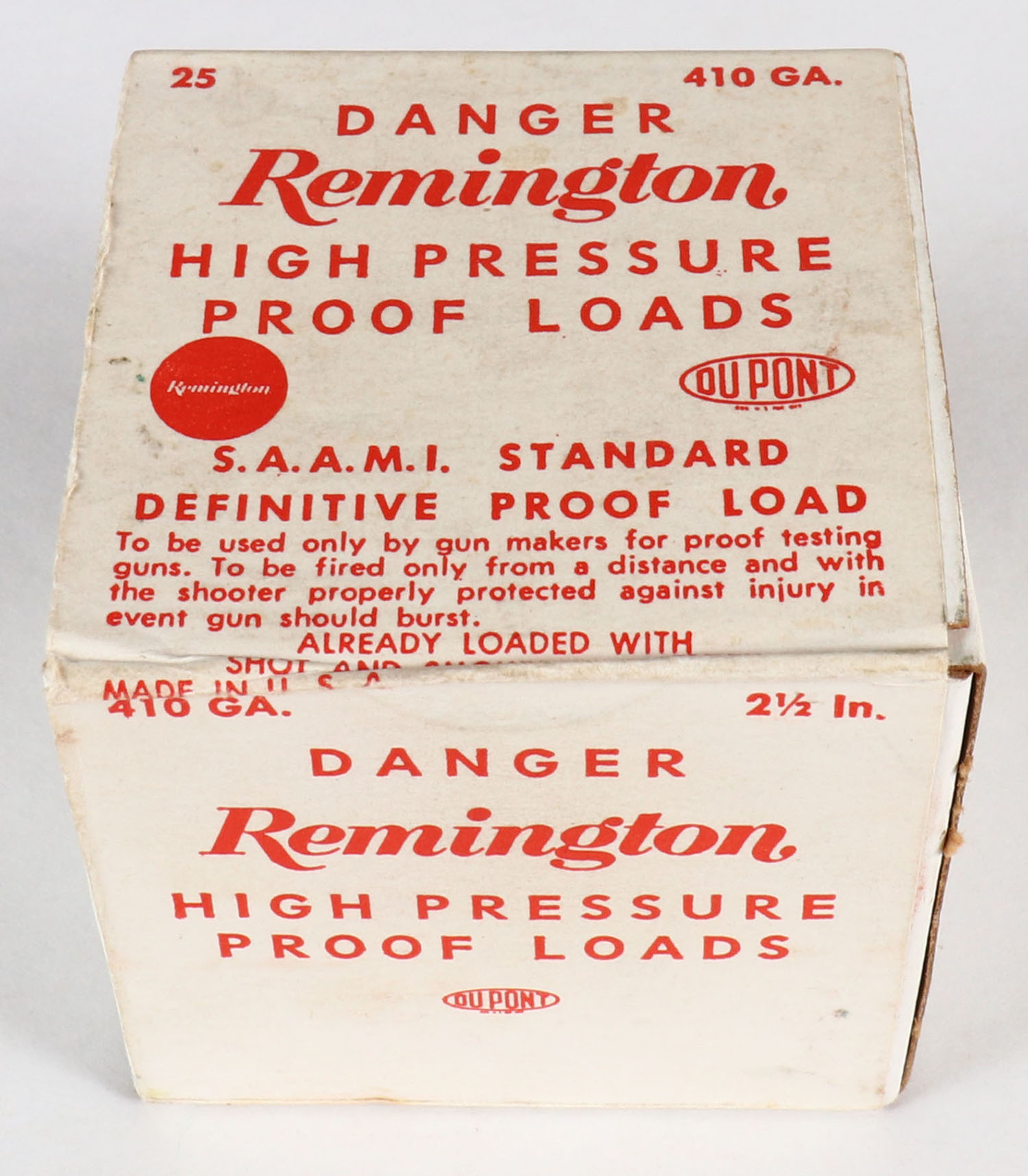 Remington, High Pressure Proof Loads, 410ga., 1pc., FULL & SEALED, buff box with white & red label, box is very solid with excellent label. Grade: Excellent ++ - Value: 30 to 100