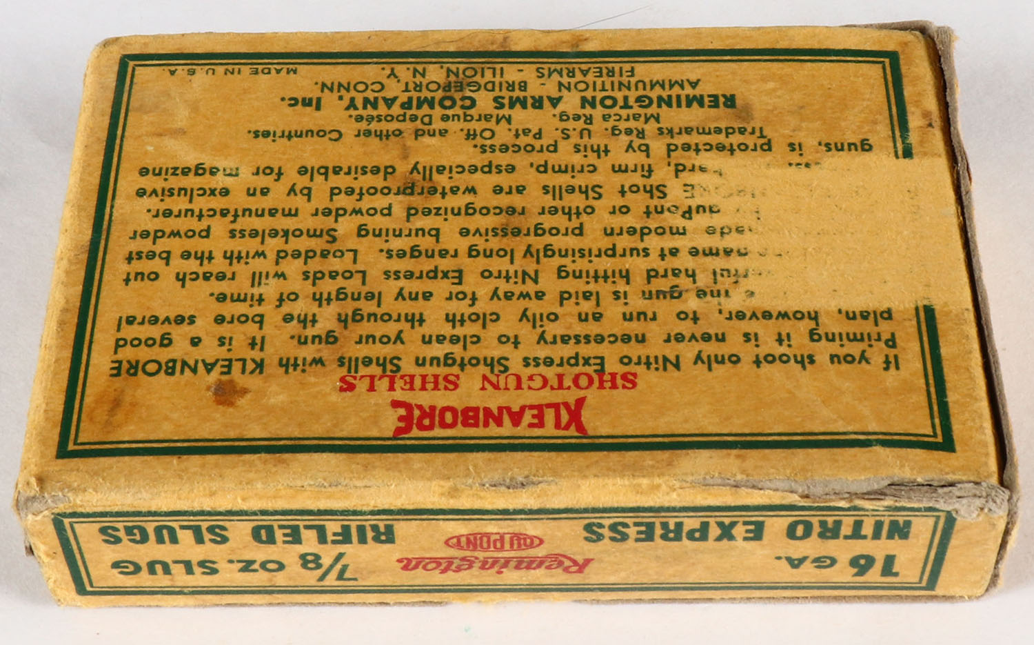Remington, Kleanbore, NITRO EXPRESS, 16ga., 1pc., Full, shot size Rifled Slugs, box is buff, red and green, box has scuffing, paper shells are very good. Grade: Very Good - Value: 10 to 30