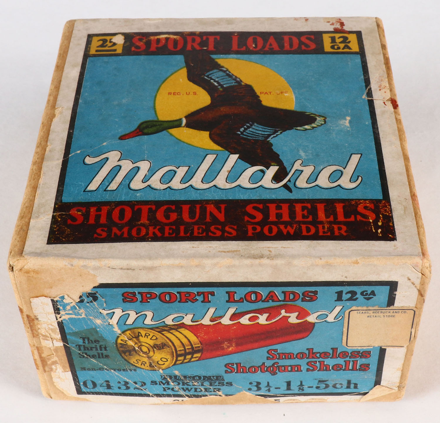 Sears Roebuck & Co., Sports Loads MALLARD, 12ga., 2pc., Partial 14rds., shot size 5 Ch, buff box with multi colored label that pictures a Mallard flying with a yellow moon in background, box has light age soiling with scuffing, paper shells are excellent. Grade: Very Good ++ - Value: 60 to 300