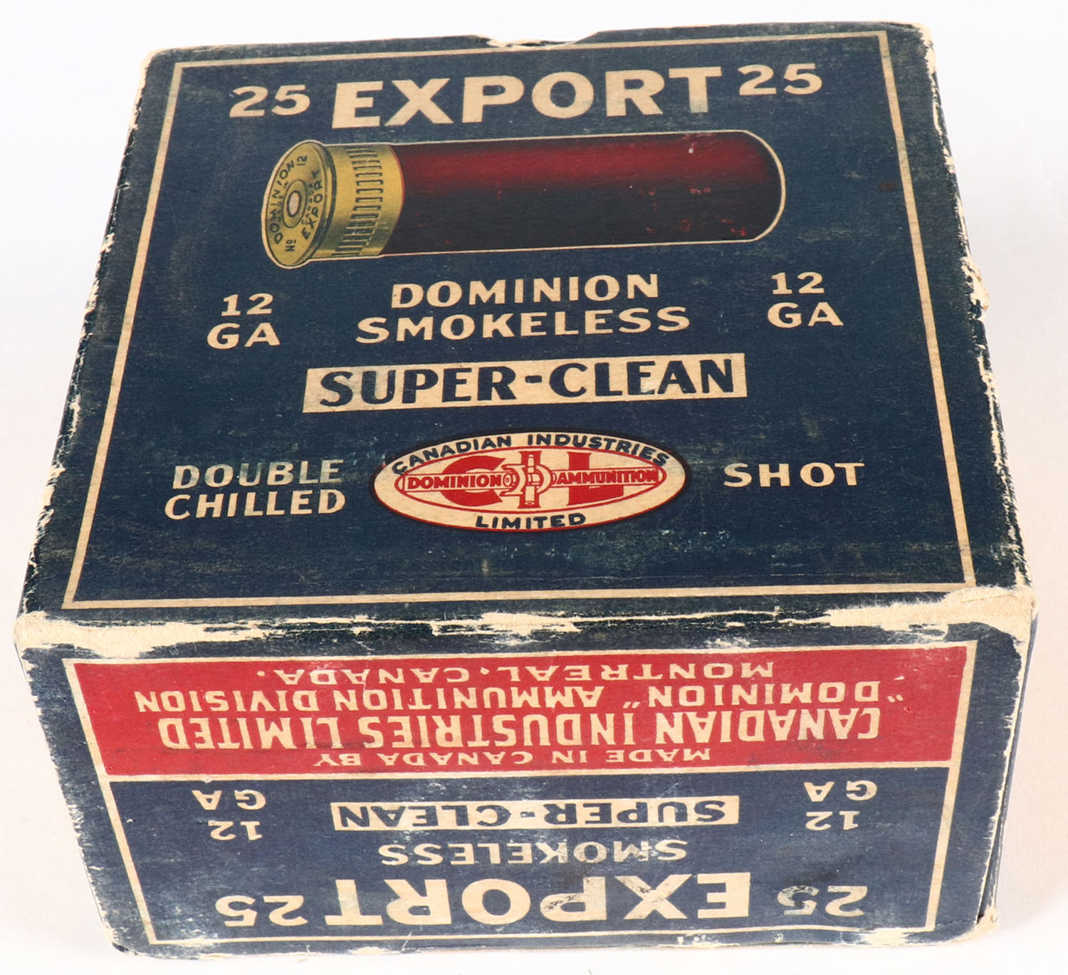 RARE Dominion Cartridge Co., EXPORT, 12ga., 1pc., Empty, shot size 6CH, multi-colored box, box has scuffing with edge wear. Grade: Very Good + - Value: 40 to 200