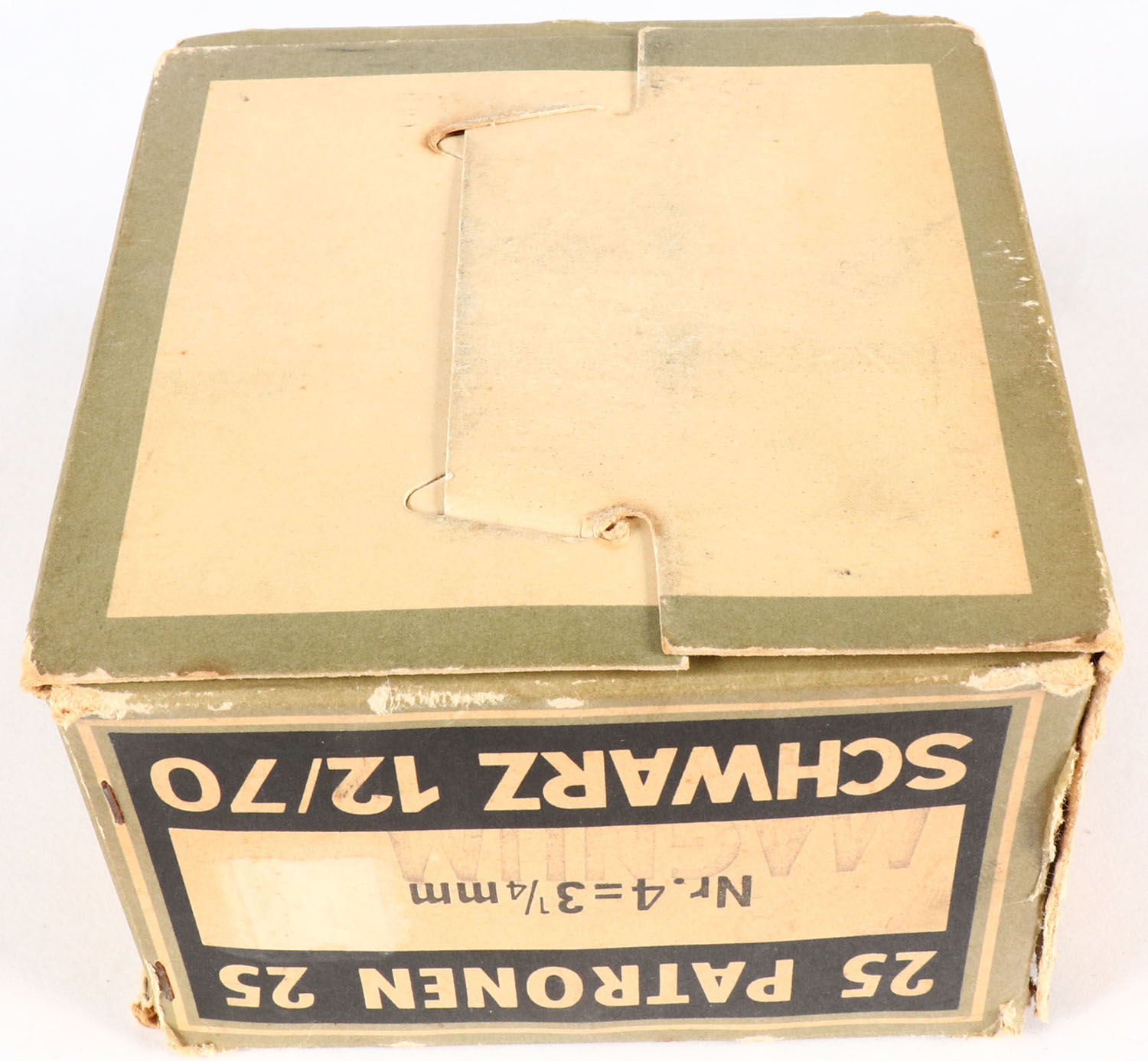 Rottweil Rauchlos, has original Insert, 12ga., 1pc., Full, shot size 4, buff box with multi colors, box has edge wear with a seam split, shells are excellent. Grade: Very Good ++ - Value: 10 to 40