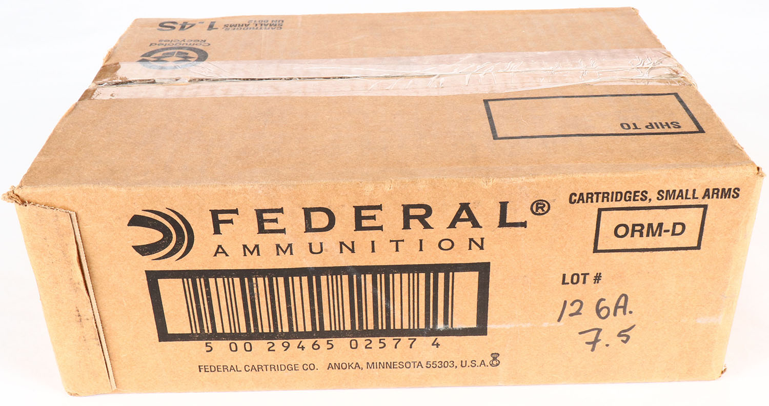 Federal, 12ga., 1pc., FULL & SEALED case of 10 boxes, 250rds., shot size 7 1/2, case is very solid. Grade: Excellent + - Value: 50 to 150