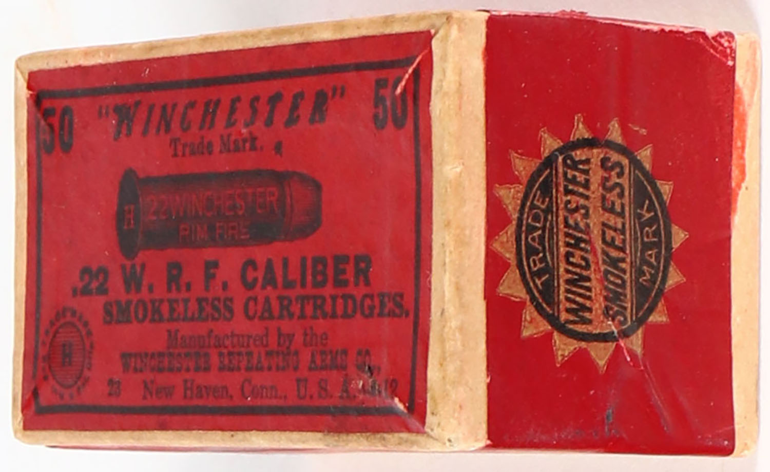 Winchester, Smokeless Cartridges, .22 W.R.F., RR: WRA-156 WRF-21a, FULL & SEALED, 2pc. Buff box with red top & side sealing labels, box is near mint with minty color, only very minor shelf wear & corner wear, edges are crisp, labels are intact. Grade: Excellent ++ - Value: 200 to 800