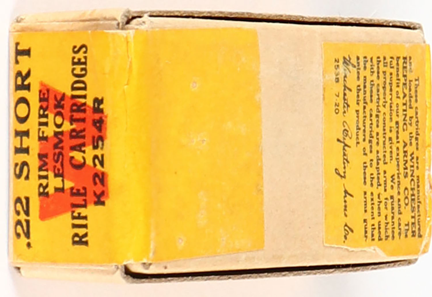 Winchester, Lesmok Rifle Cartridges, .22 Short, RR: WRA-177 S-65c, FULL & SEALED, 2pc. Buff box with green & yellow wraparound label, box is solid with excellent color, very minor shelf & corner wear, edges are crisp, label is intact. Grade: Excellent + - Value: 40 to 120