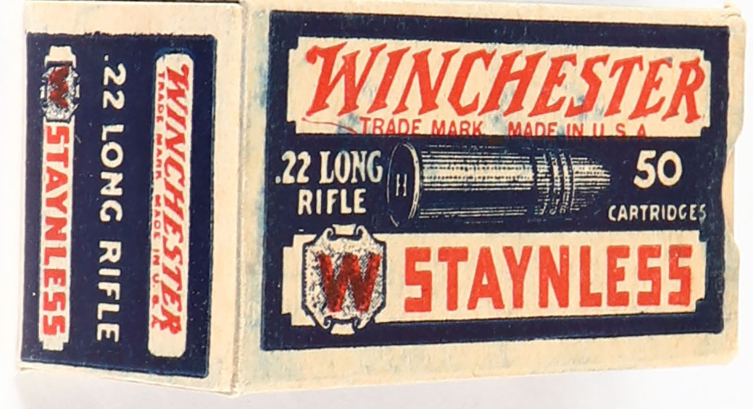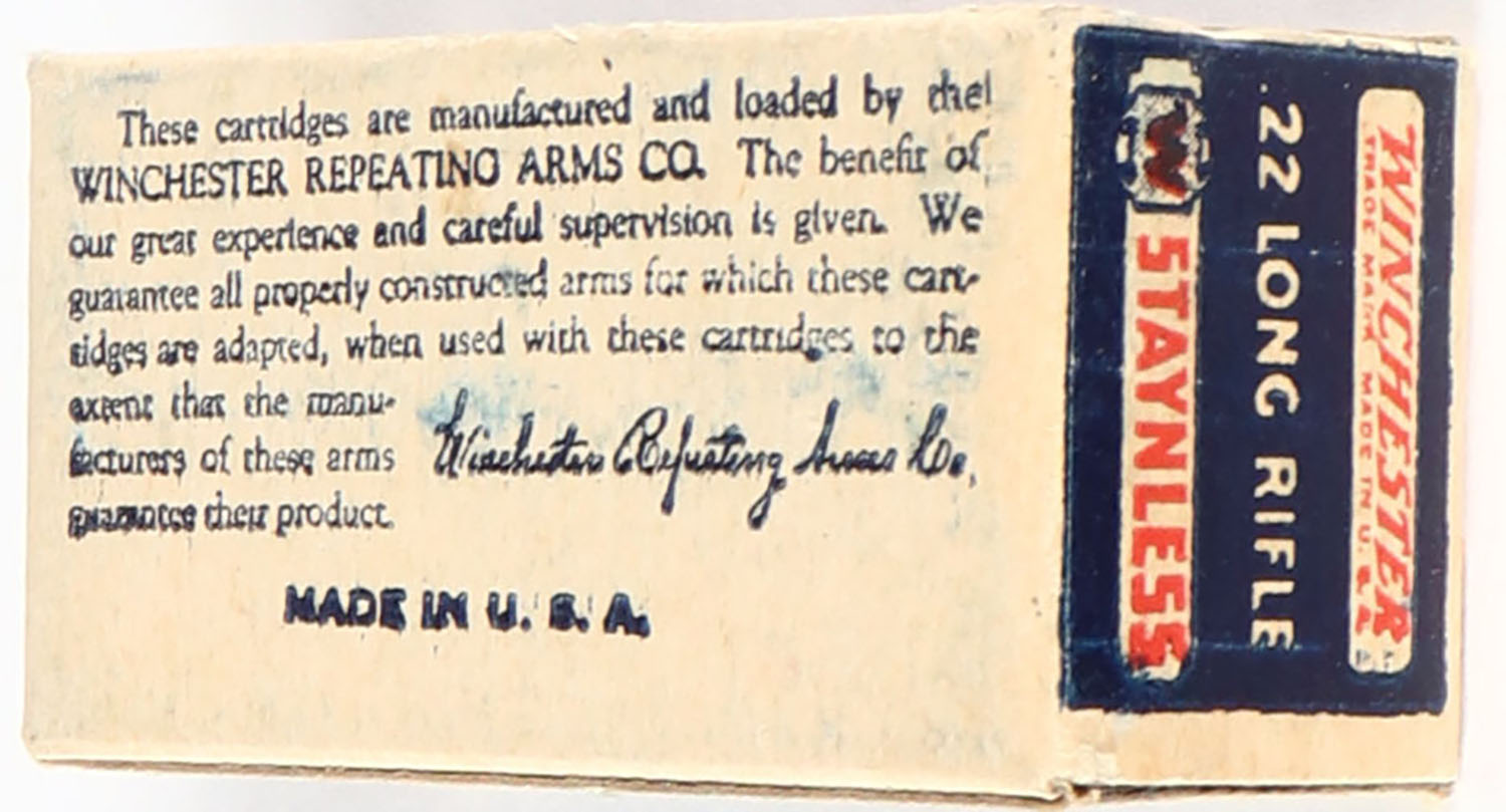 Winchester, Staynless, .22 Long Rifle, RHWeb: WRA-12B LR-1a, Full, 1pc. Blue white & red box, box is solid with very good color, minor age soiling & shelf wear, very minor corner wear, edges are crisp, end flaps are solid, ammo is good. Grade: Very Good ++ - Value: 30 to 90