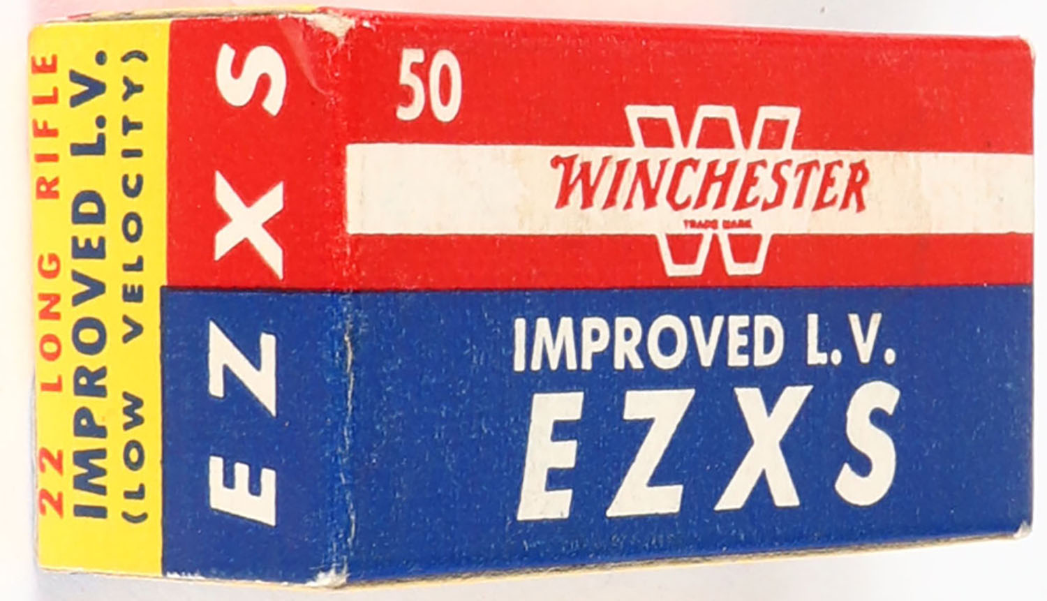 Winchester, Improved L.V. EZXS, .22 Long Rifle, Match Cartridges, RHWeb: WRA-54 LR-8b, Full, 1pc. Blue yellow & red box, box is near mint with minty color, only very minor corner wear, edges are crisp, end flaps are solid, ammo is excellent. Grade: Excellent + - Value: 30 to 90