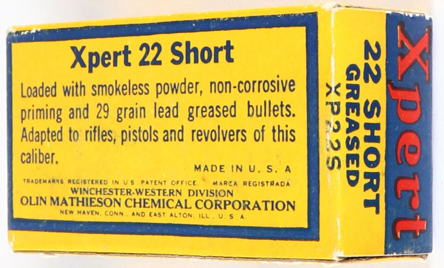 Western, Xpert, .22 Short, RHWeb: WCC-52 S-1g, Full, 1pc. Yellow blue & red box, box is solid with excellent color, very minor edge & corner wear, end flaps are solid, ammo is excellent. Grade: Excellent + - Value: 10 to 30