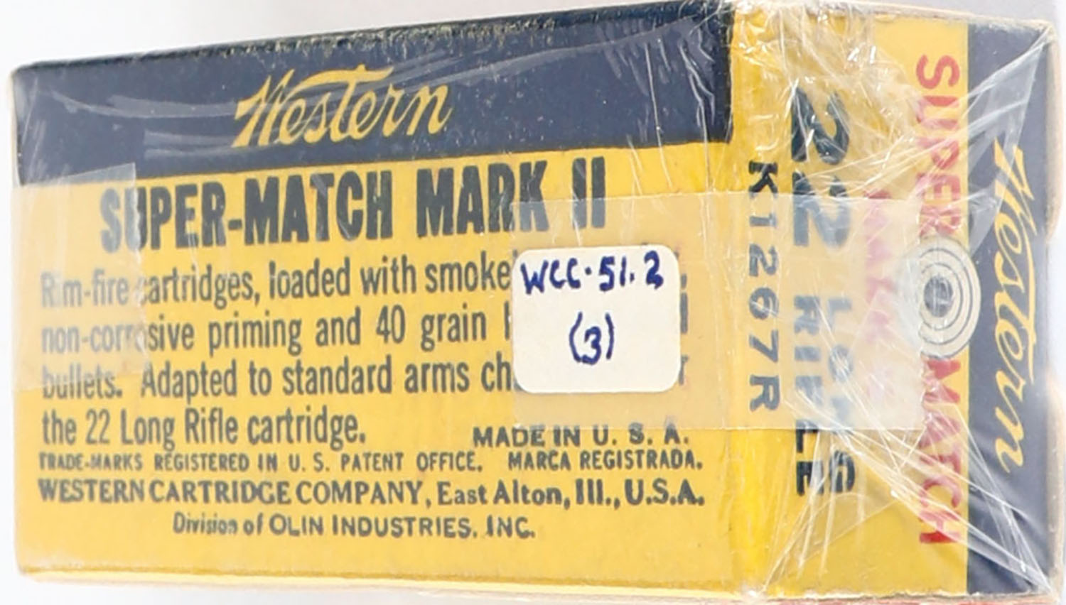 Western, Super Match Mark II, .22 Long Rifle, RHWeb: WCC-51.2 LR-3g, Full, 1pc. Yellow blue & red box, box is solid with excellent color, some color bleeding, corners are mostly sharp, edges are crisp, damage to one flap, ammo is excellent. Grade: Excellent - Value: 8 to 40
